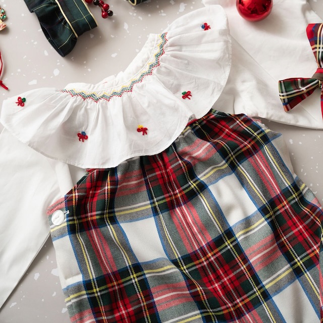 Long Christmas tartan dungarees with lace details on the front and back. A classic, charming piece for magical family moments.