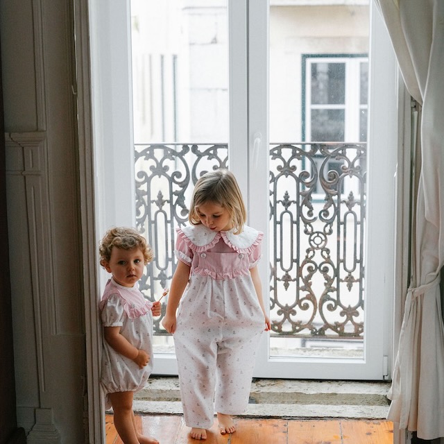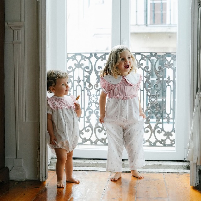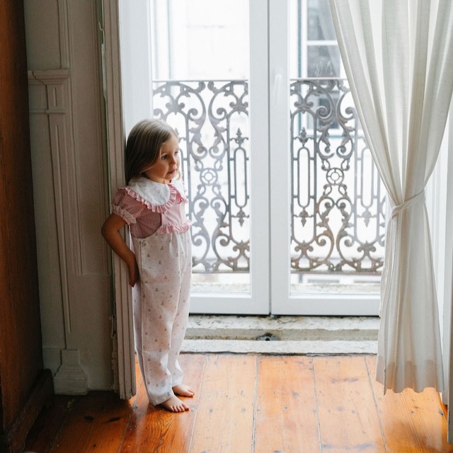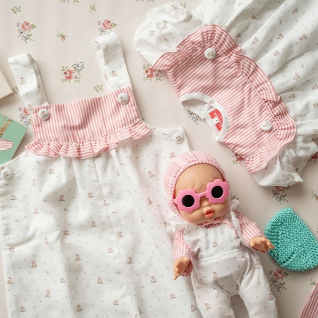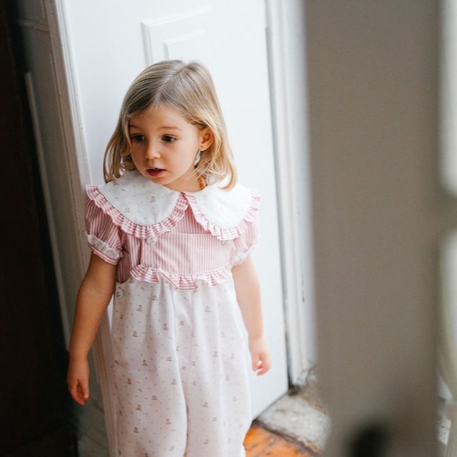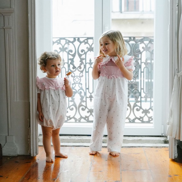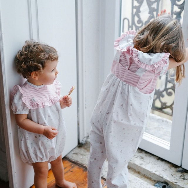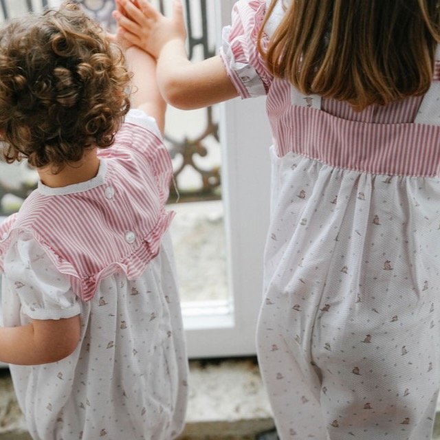 A very sweet pair of dungarees made in a soft fabric with a delicate bunny and tiny floral print. They stand out for their pink striped bib, finished with a soft ruffle that gives them a truly special, romantic and timeless touch.