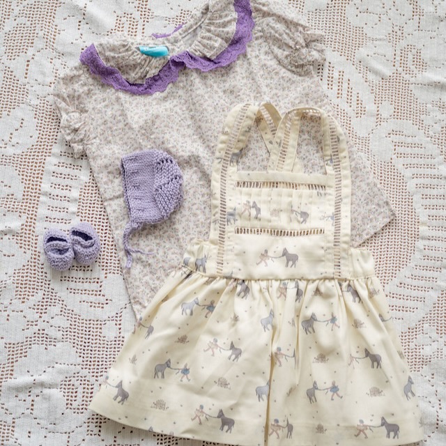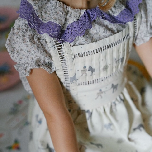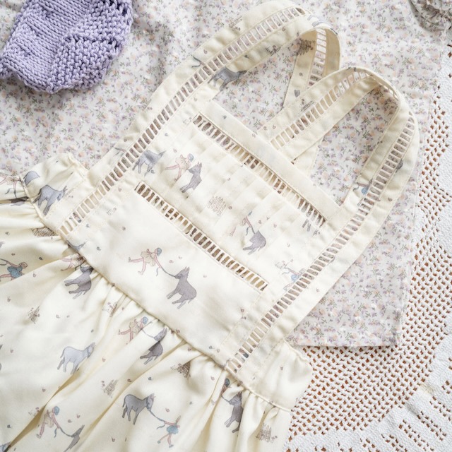 A very special pinafore skirt, featuring an adorable print of little girls with donkeys and delicate insertion lace details for a classic, timeless touch. Perfect to wear with the matching floral shirt from the same line.