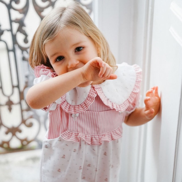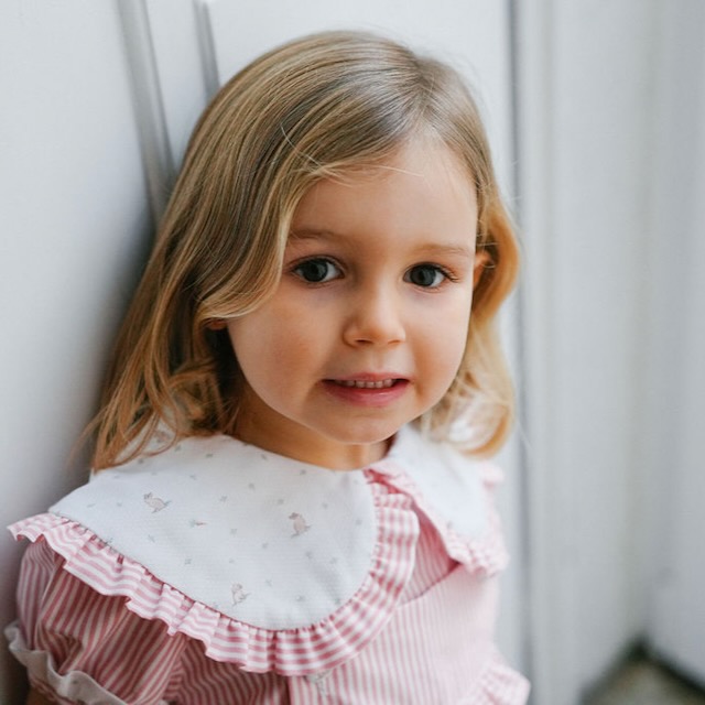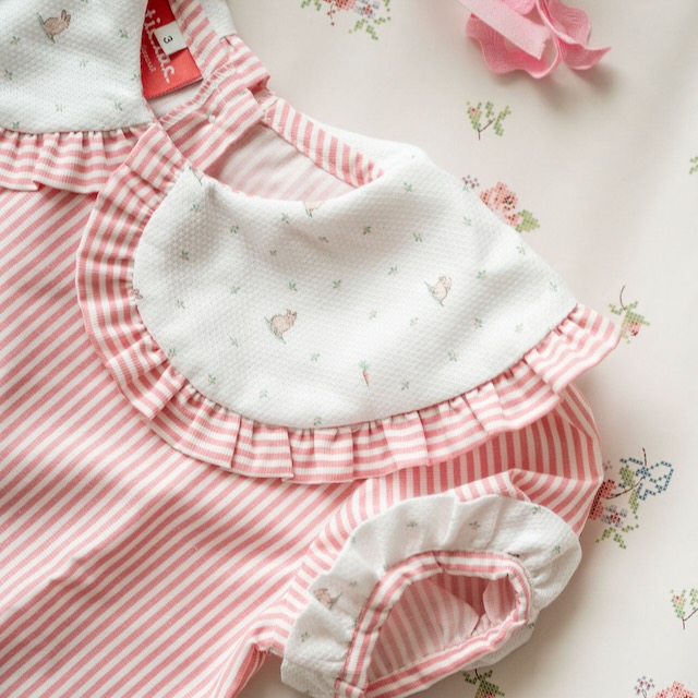 Made in pink striped fabric, it stands out for its large collar featuring a delicate bunny and tiny floral print, finished with a soft ruffle that gives it a romantic and classic feel. The carefully crafted details and the contrast of fabrics make this piece truly special.