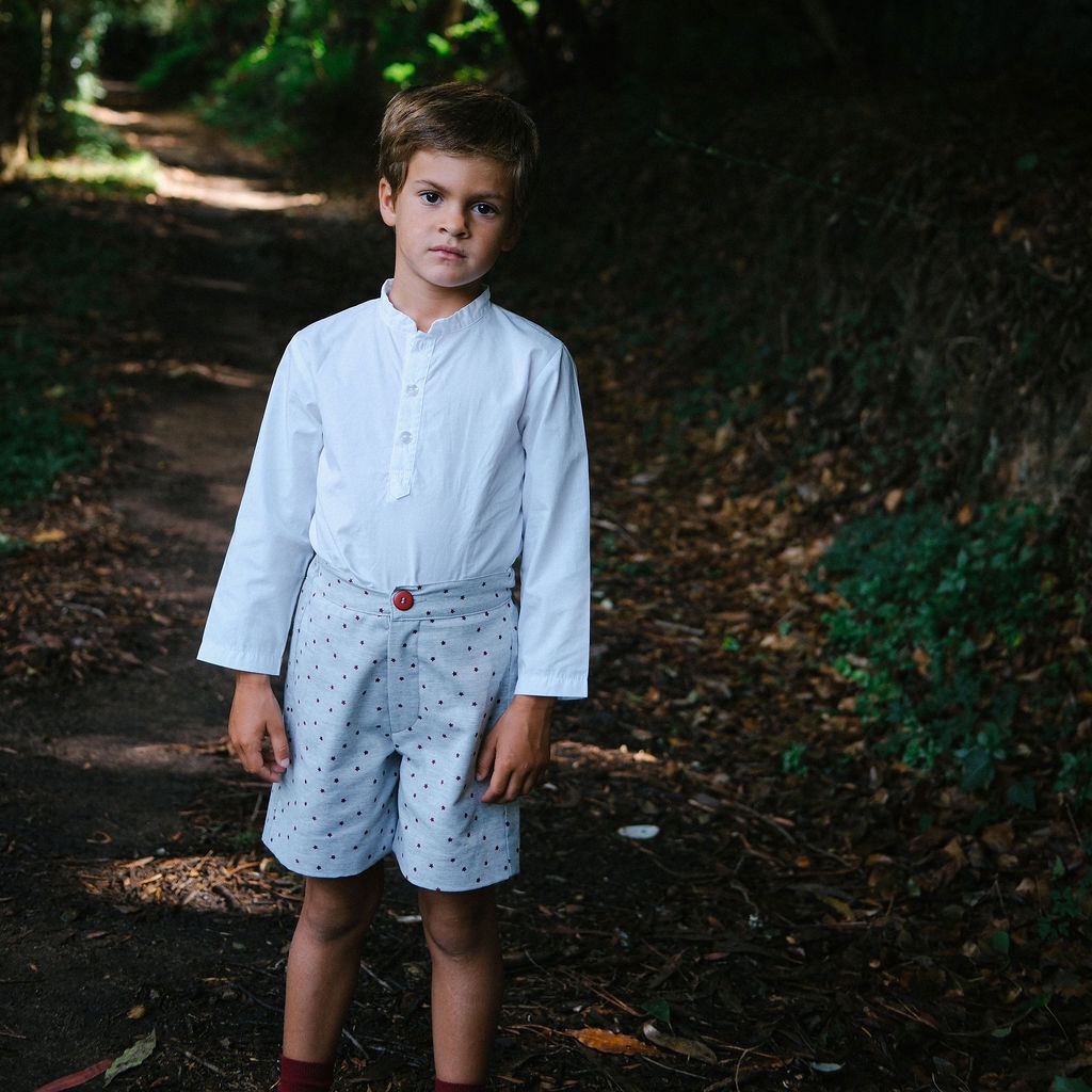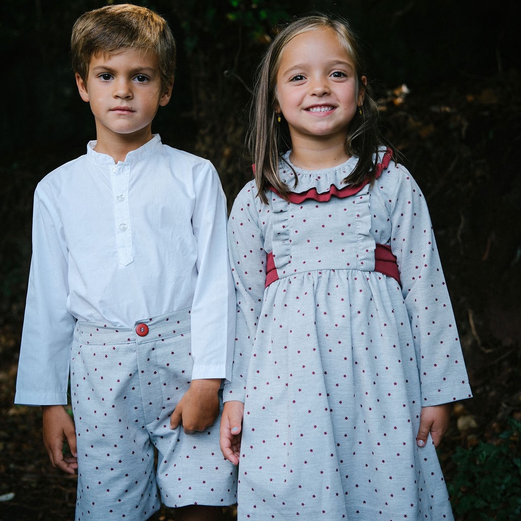 Calções clássicos em tecido cinza claro com pequenas estrelas bordeaux, que combinam elegância e conforto. O seu corte intemporal e os detalhes cuidadosamente trabalhados tornam esta peça perfeita para ocasiões especiais e dias festivos, mantendo a liberdade de movimentos dos mais pequenos.