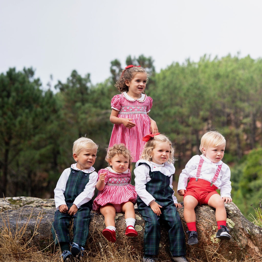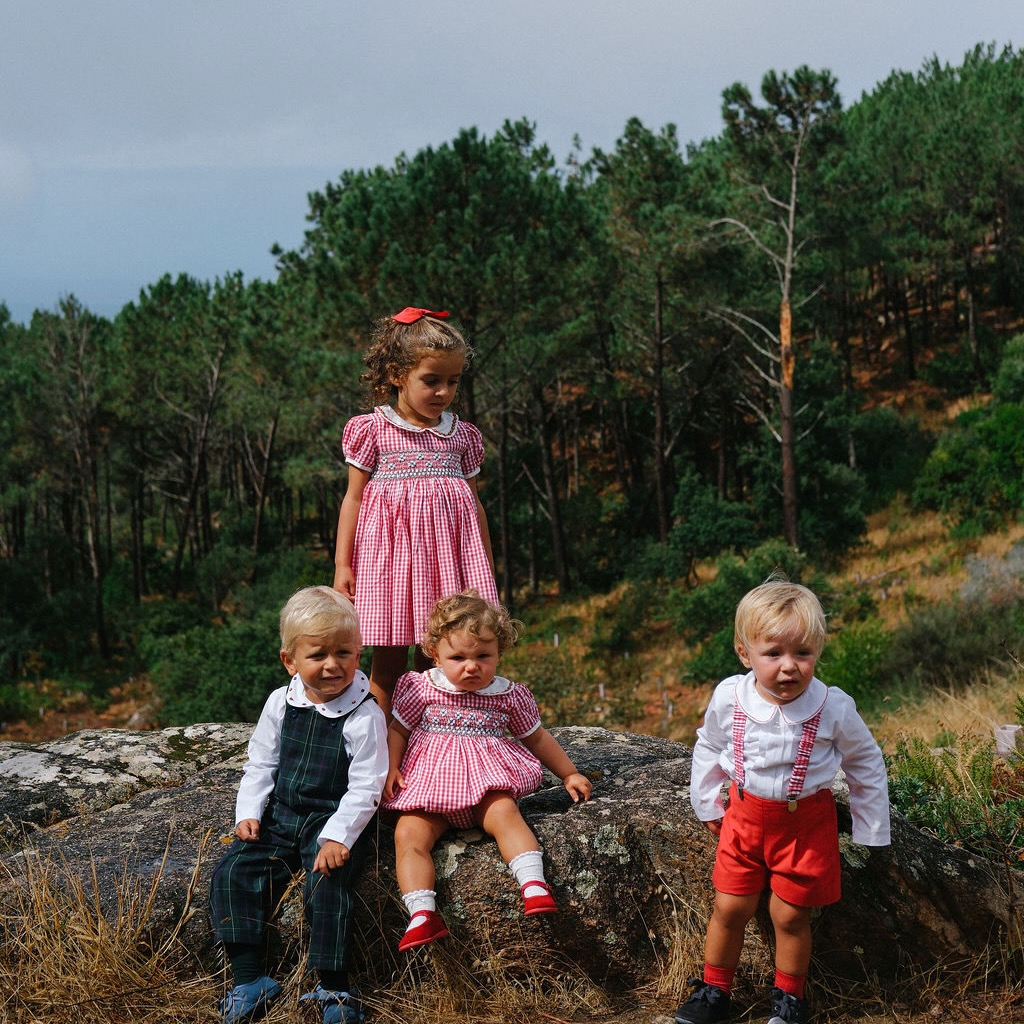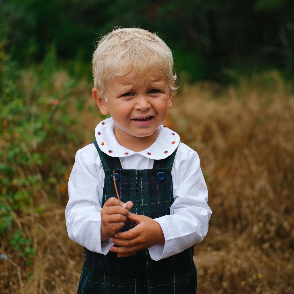 Esta camisa branca de manga comprida com gola redonda bordada à mão em tons natalícios, foi pensada para conjugar com as nossas jardineiras.