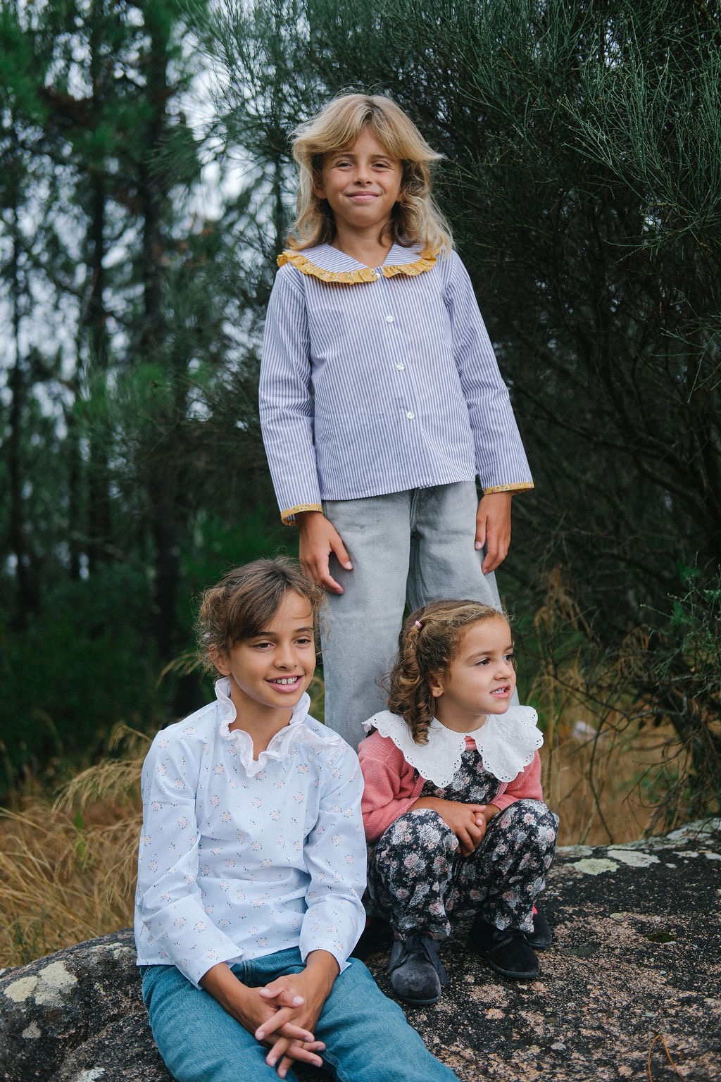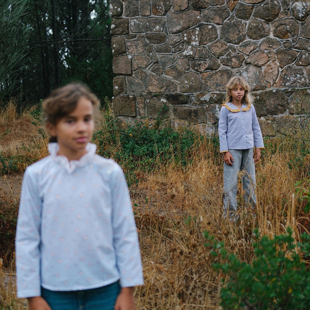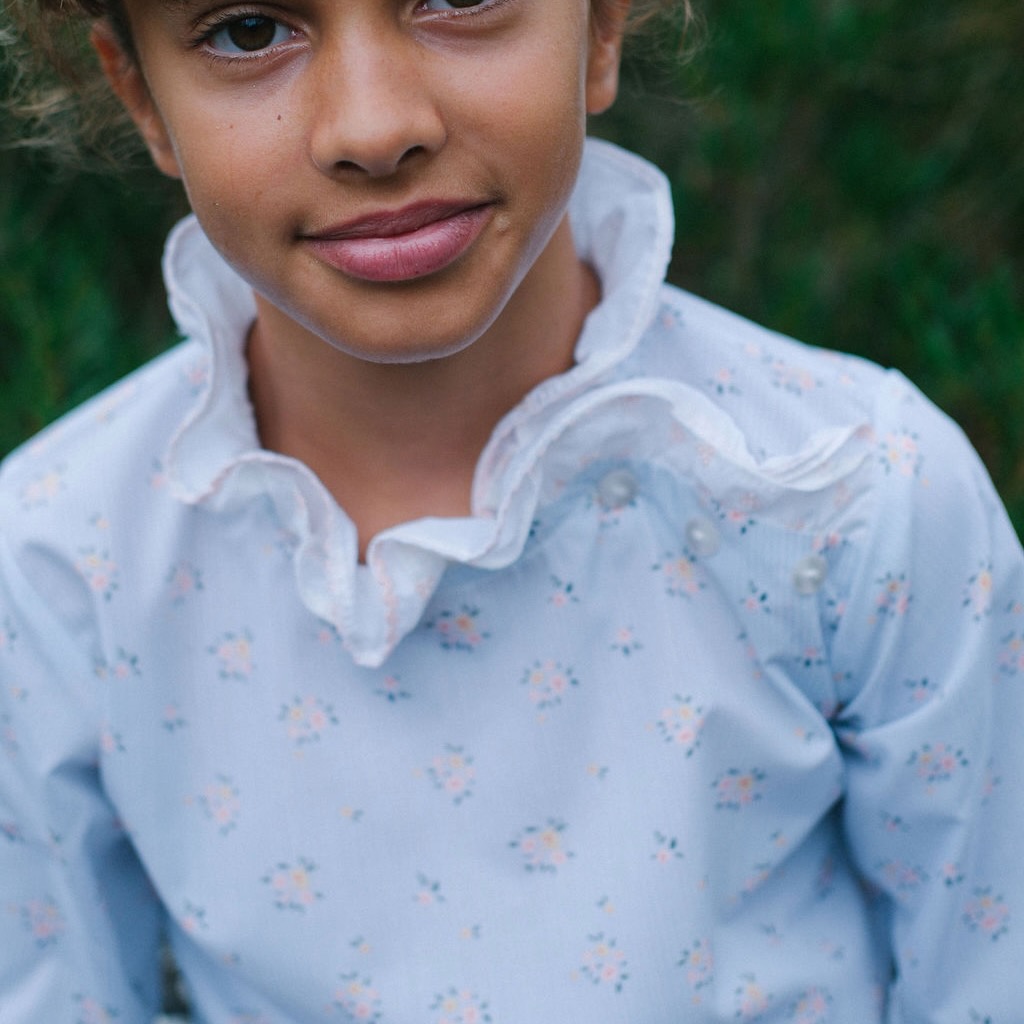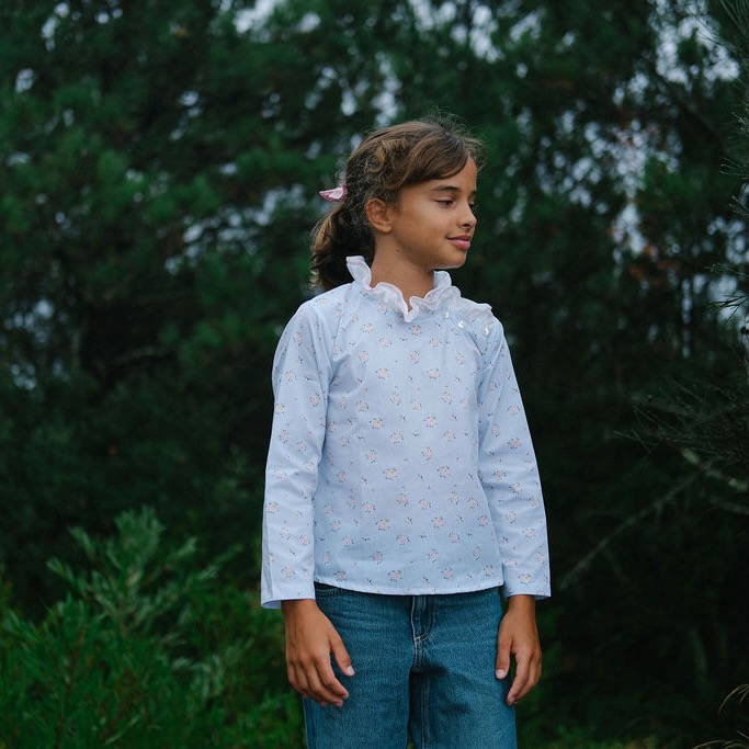 Uma camisa delicada e elegante, pensada para os dias de outono e inverno. Confeccionada em tecido azul claro com padrão de flores em cores clarinhas, apresenta gola alta rematada com folho e pormenor de gerga, conferindo-lhe um ar romântico e intemporal. Os botões laterais em madrepérola facilitam a abertura e dão um toque especial ao design.