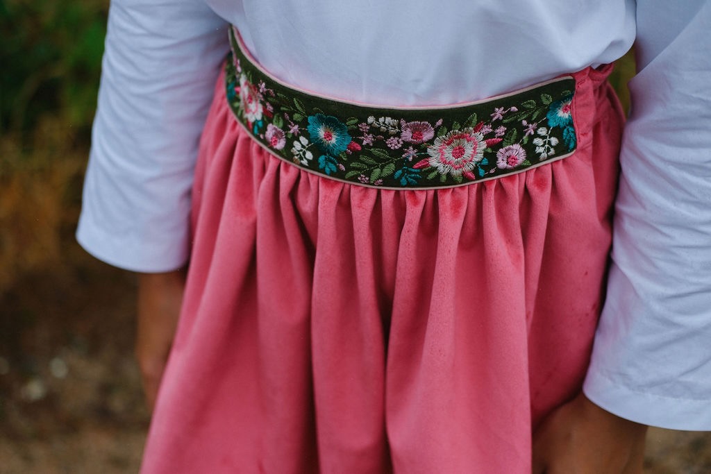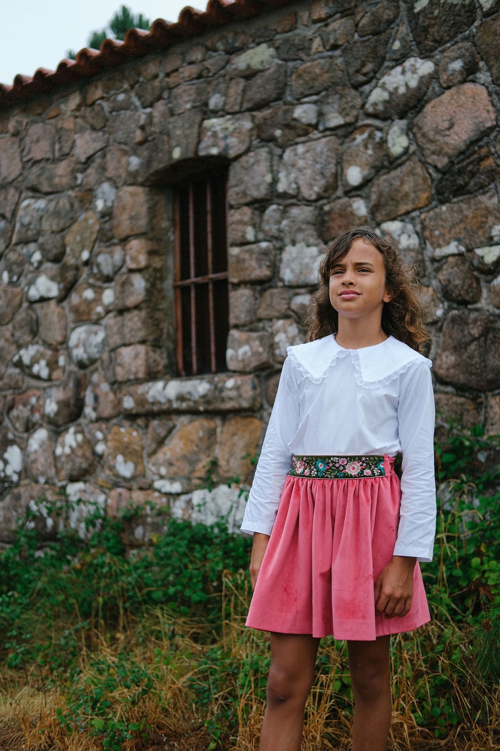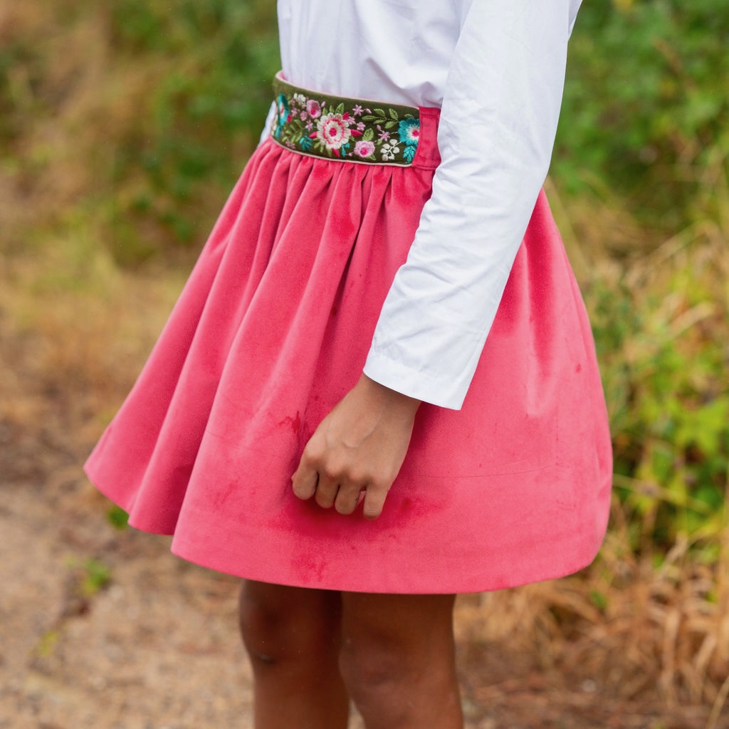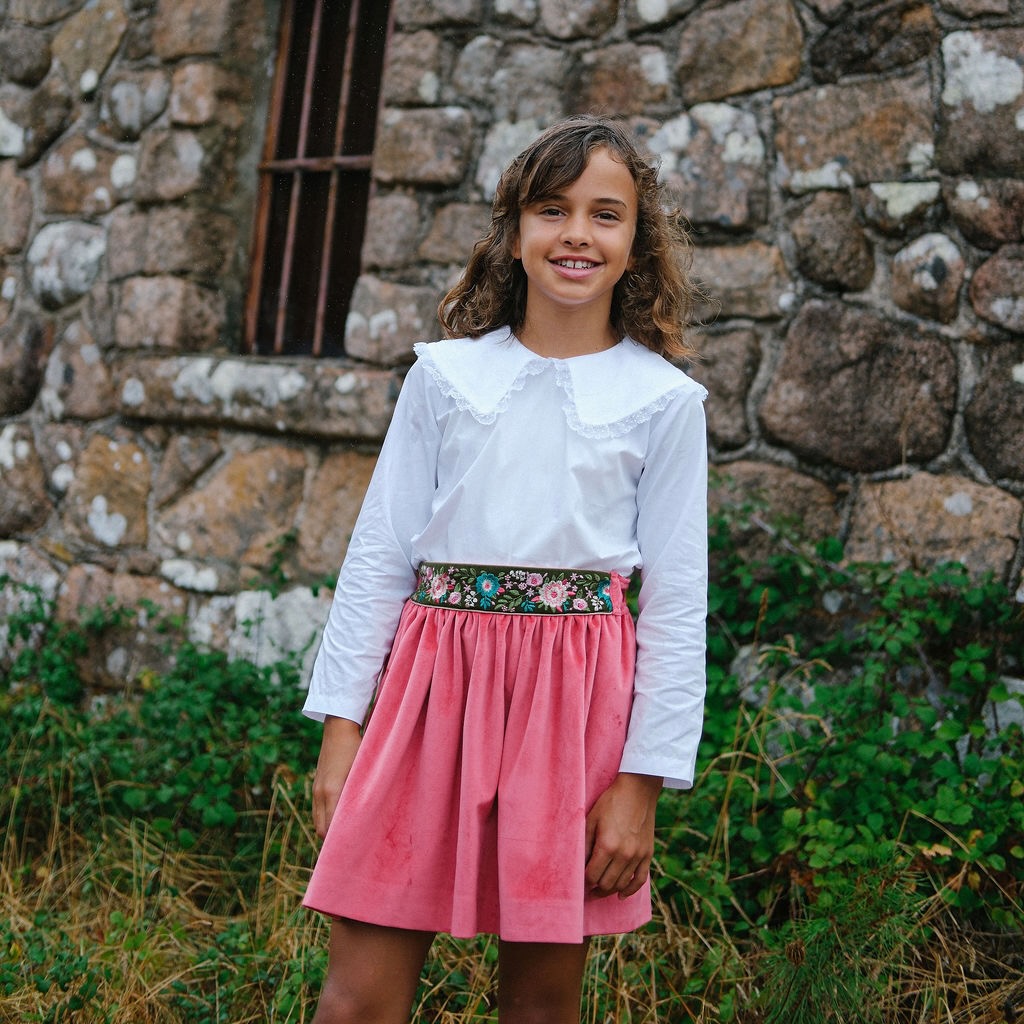 Conjunto de rapariga composto por camisa branca de manga comprida com gola grande com renda t saia em veludo framboesa com cintura alta com fita fita bordada com flores.