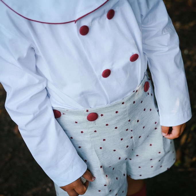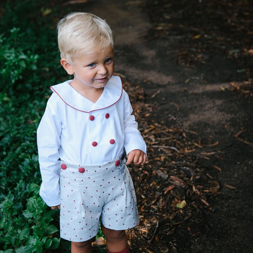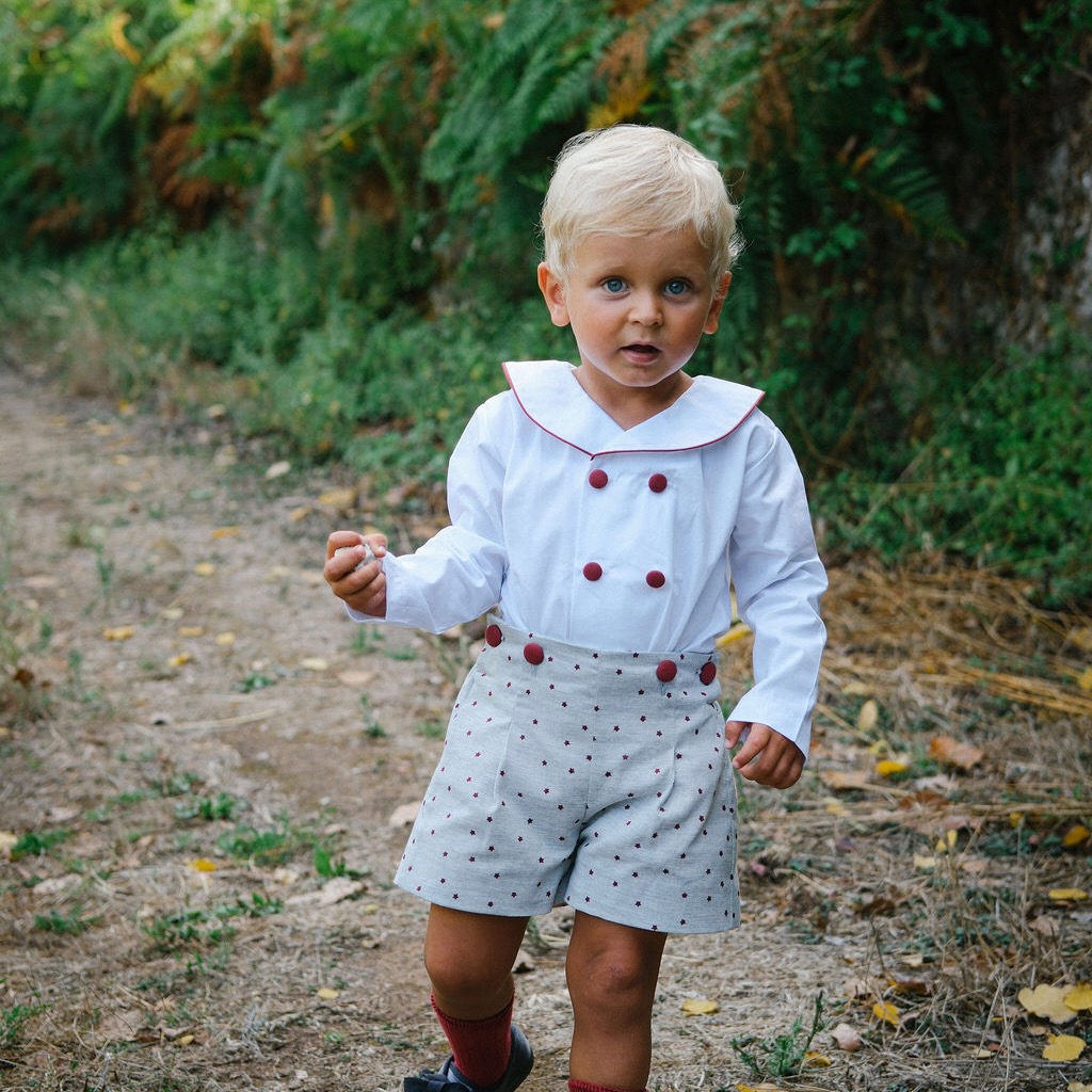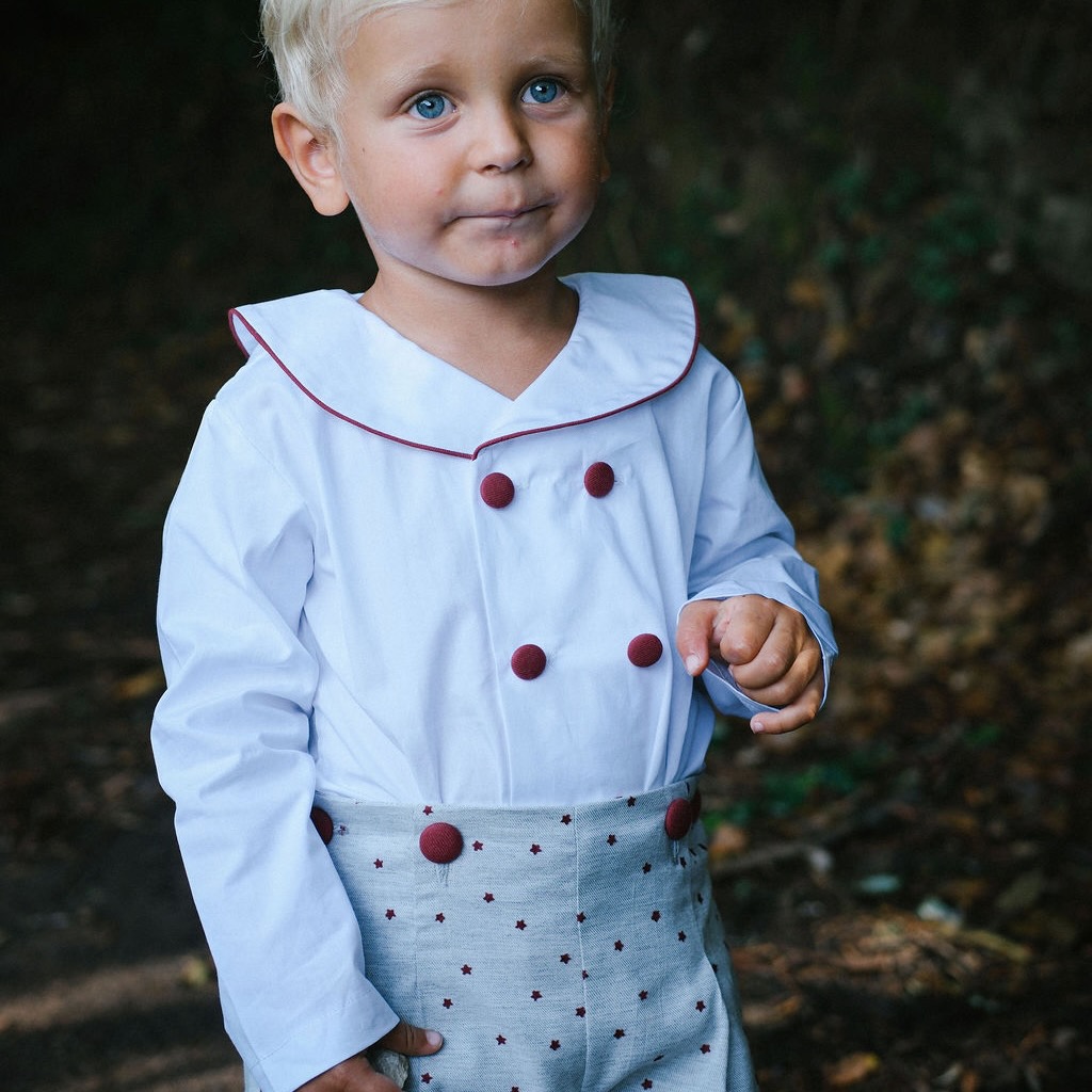 Conjunto clássico de rapaz composto por camisa branca de manga comprida com gola acertoada o e vivo bordeaux, combina com calções em tecido cinzento claro com pequenas estrelas bordeaux.