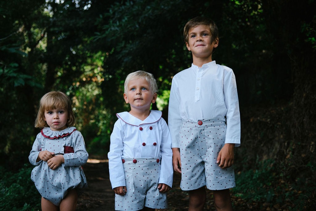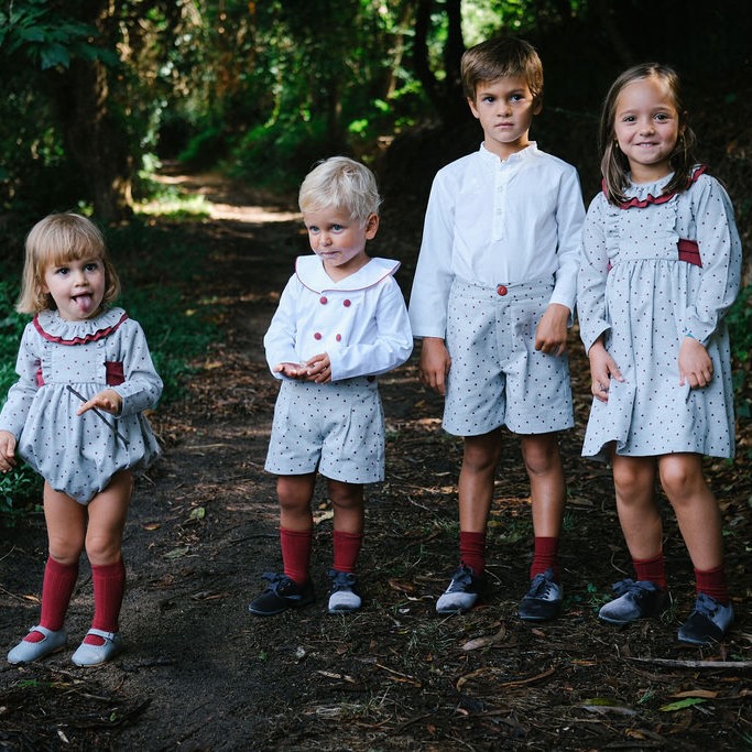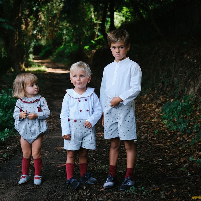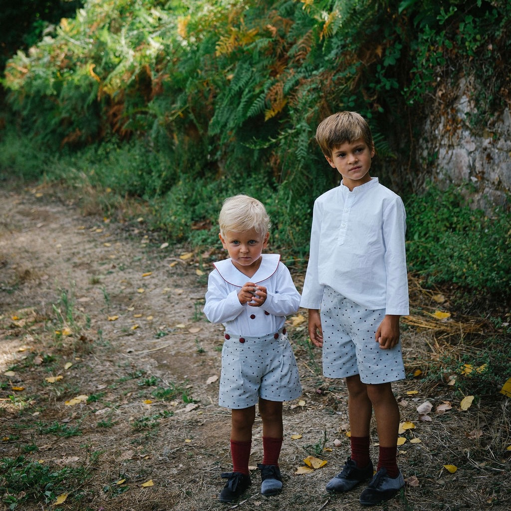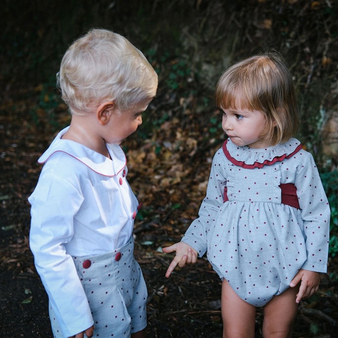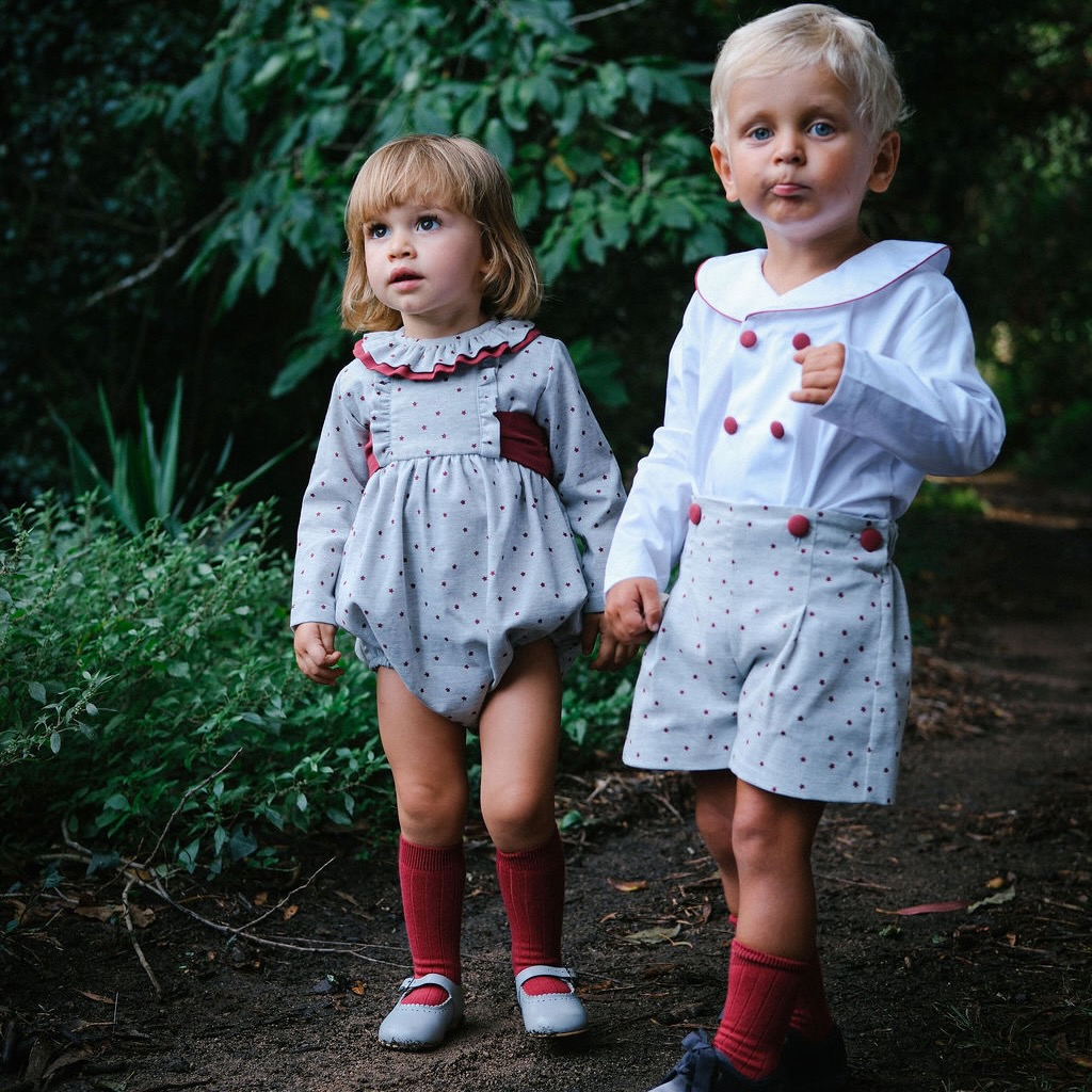 Conjunto clássico de rapaz composto por camisa branca de manga comprida com gola acertoada o e vivo bordeaux, combina com calções em tecido cinzento claro com pequenas estrelas bordeaux.