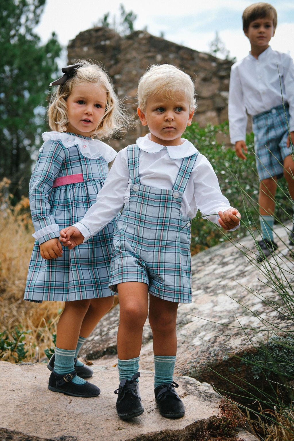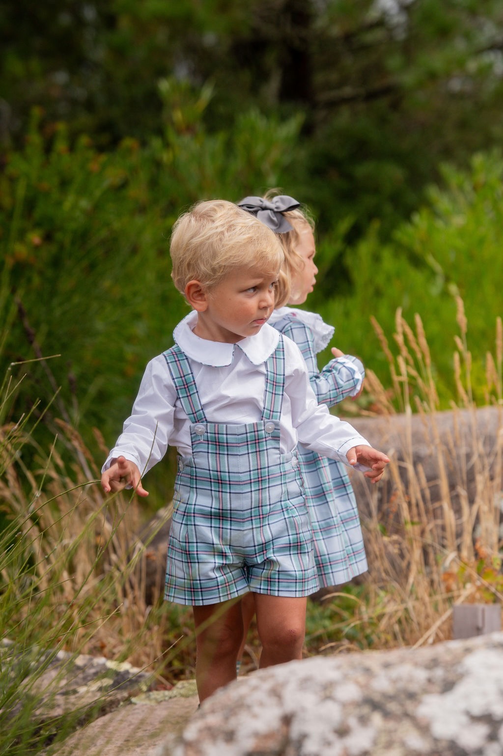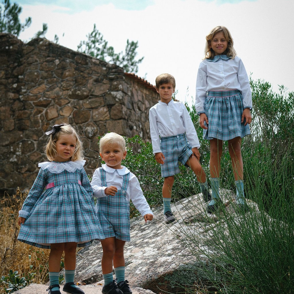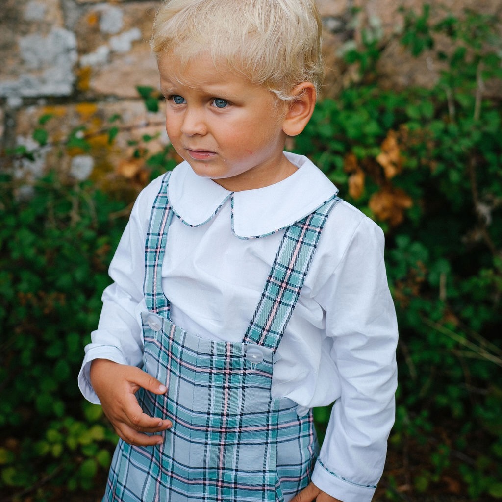 Um conjunto clássico e intemporal para rapaz, composto por camisa branca de manga comprida com gola redonda e calções em xadrez azul com alças. A camisa simples e elegante contrasta na perfeição com os calções de padrão marcado, criando um visual cheio de charme.