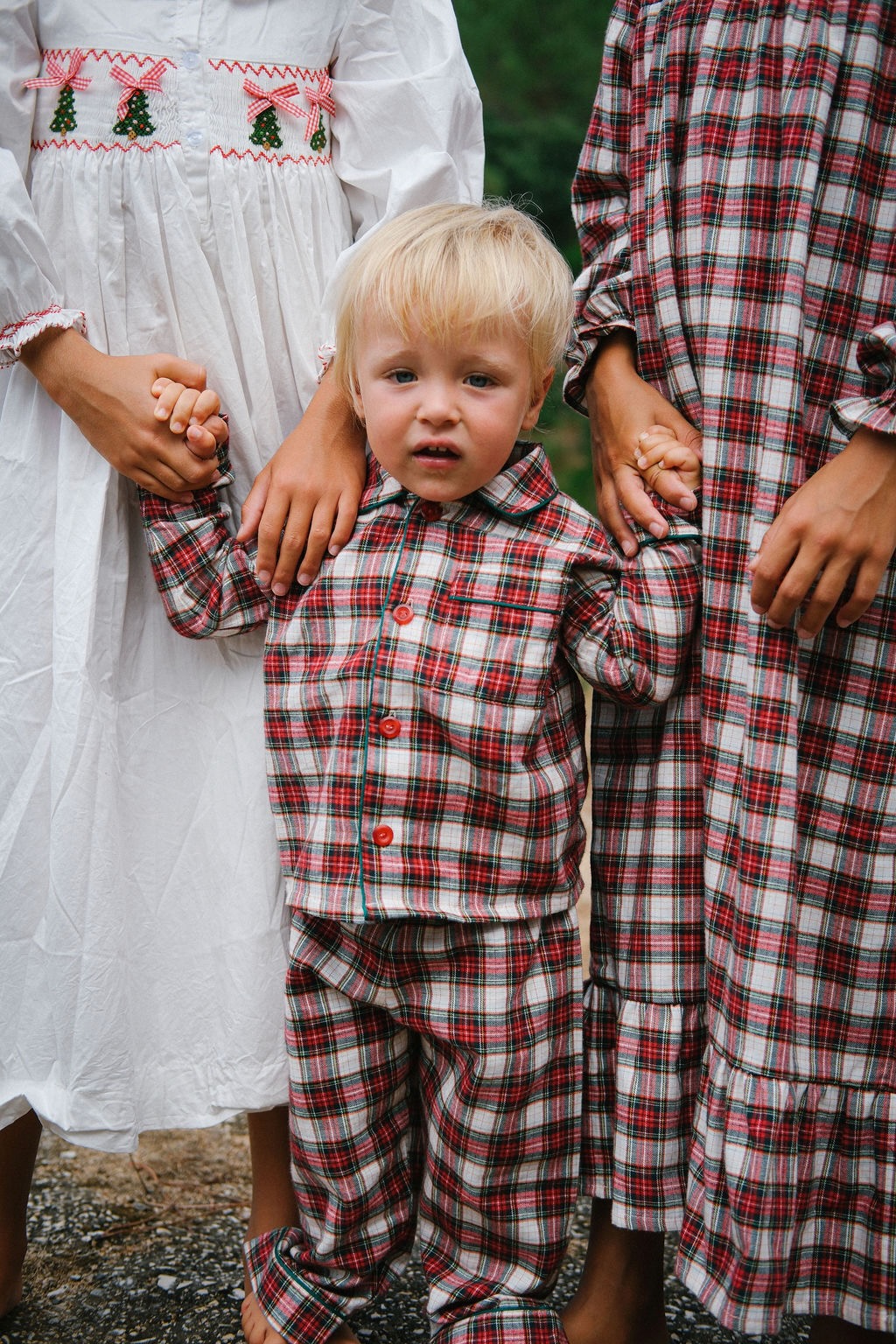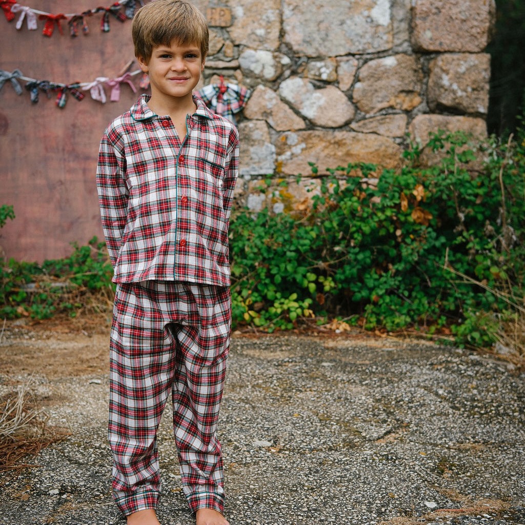 Este pijama tem uma camisa com gola clássica, botões encarnados, combina com calças direitas de cintura confortável — perfeitas para noites acolhedoras e manhãs em família cheias de risos e histórias.