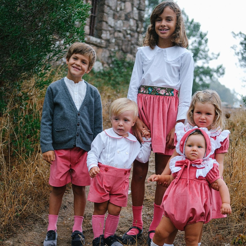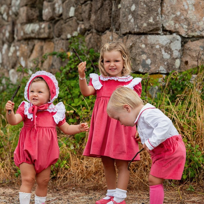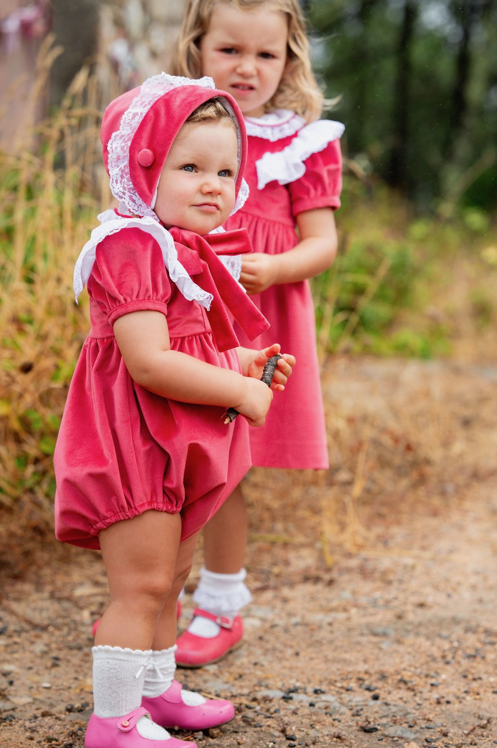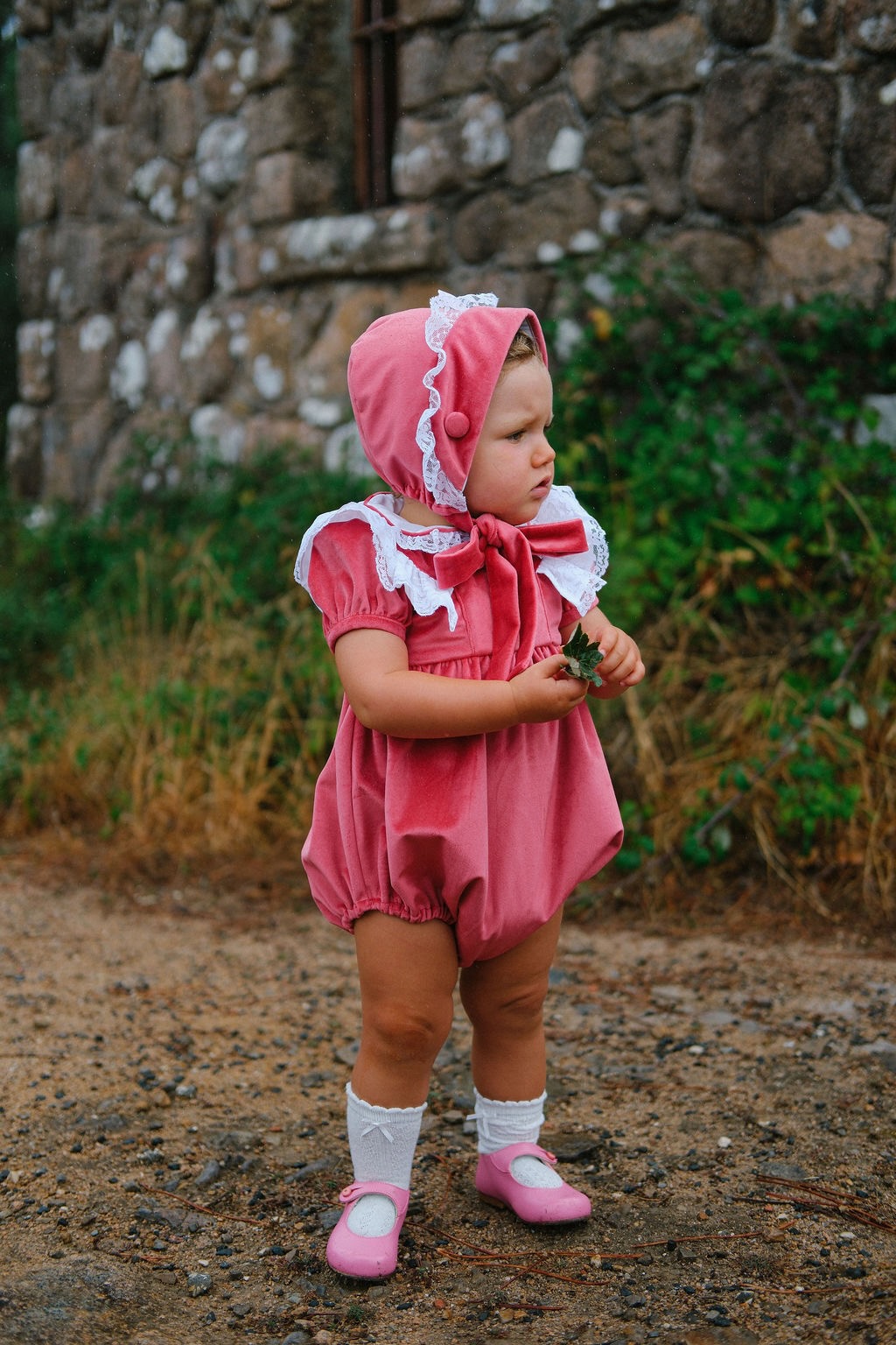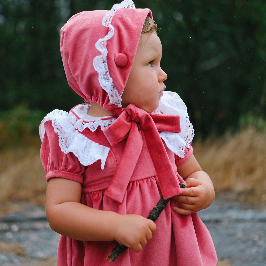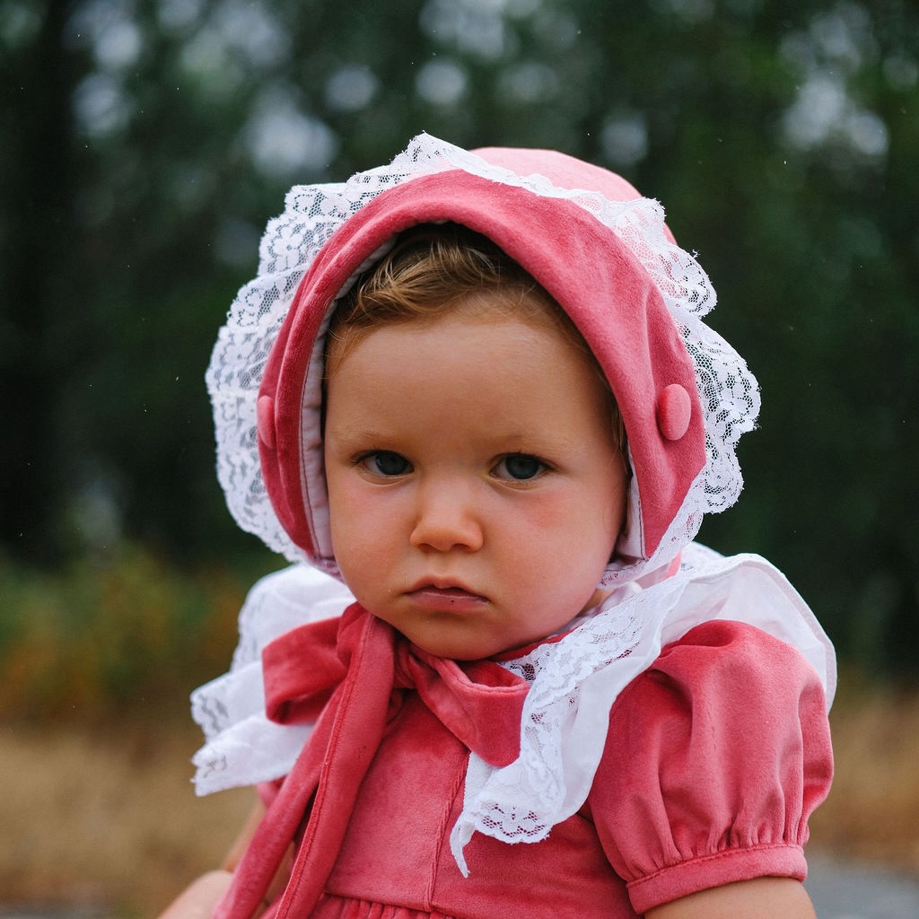 Touca clássica em veludo framboesa com acabamento em renda branca. Um acessório encantador, perfeito para completar o look dos mais pequenos com um toque intemporal e elegante.