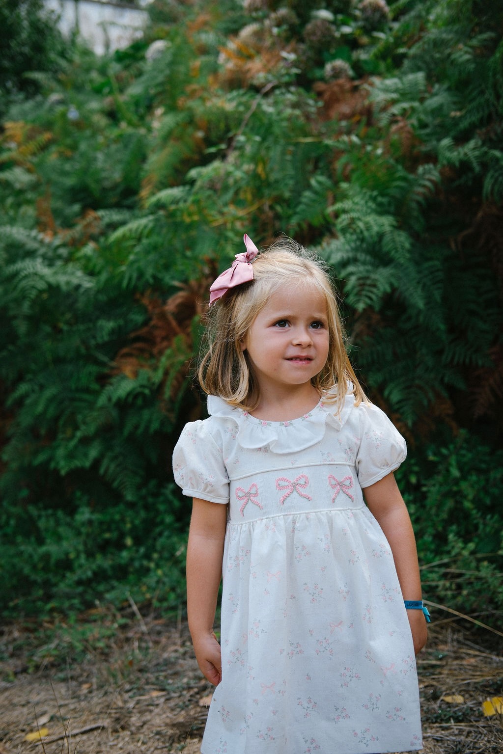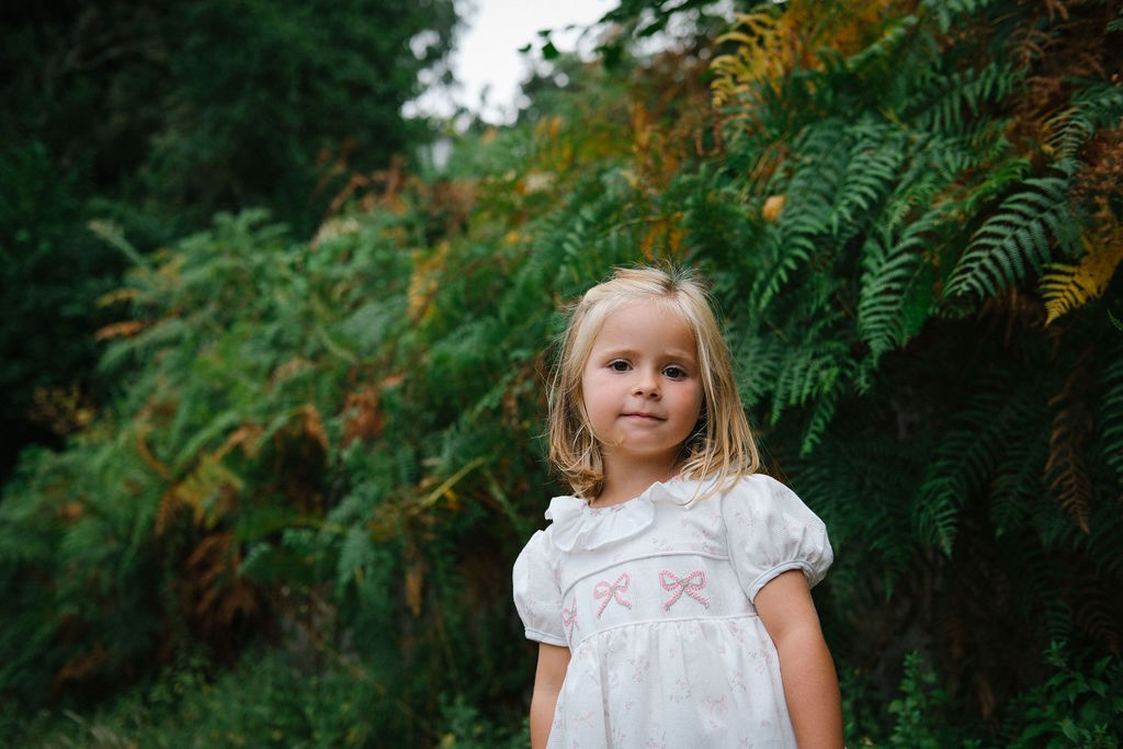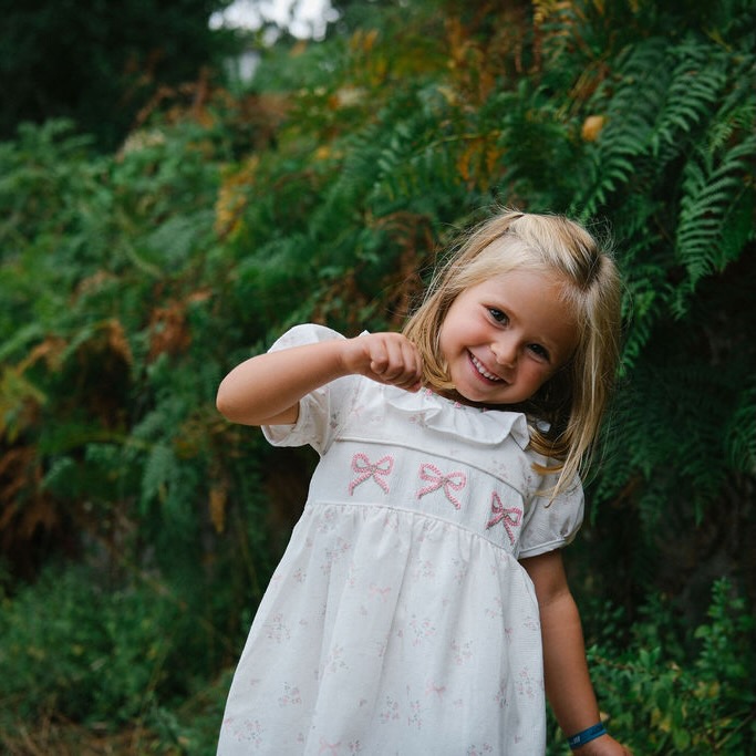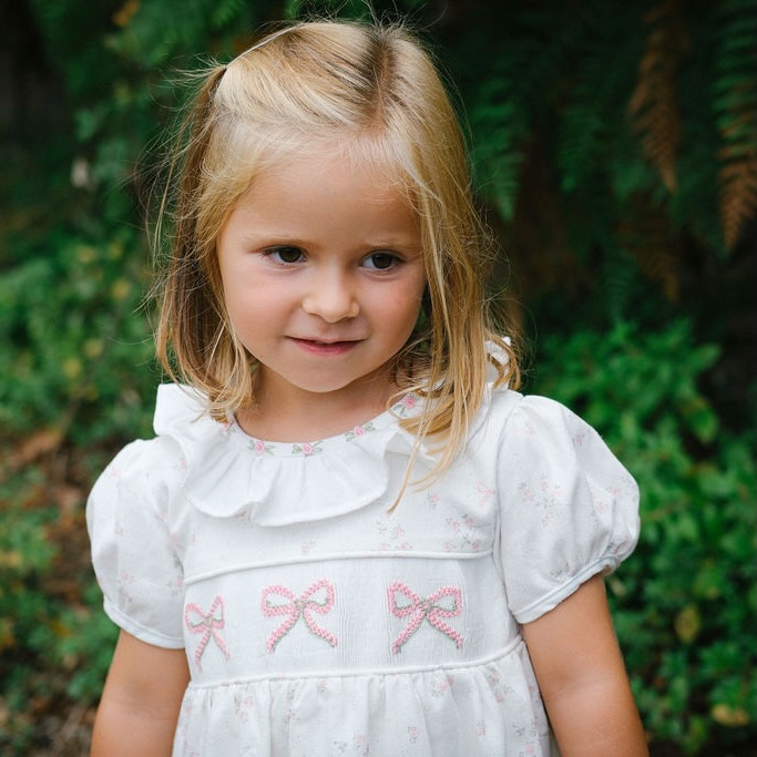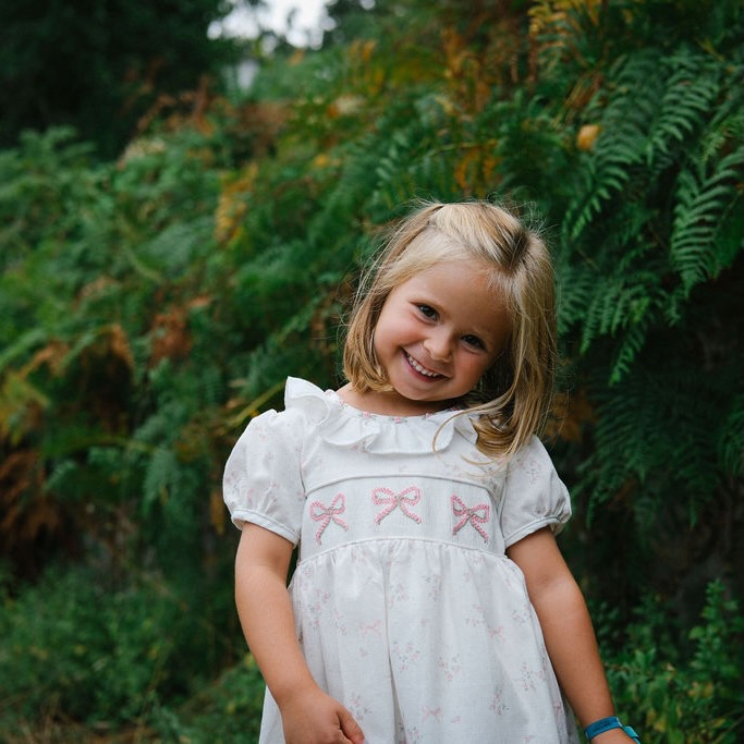 Um vestido único, feito num tecido branco com delicado padrão de flores e laços em cor de rosa, enriquecido com bordados manuais em forma de laço no corpo. A gola em folho, com acabamento bordado em pequenas flores, acrescenta ainda mais charme a este vestido. Um  vestido clássico da TicTac Babies, intemporal ideal para os dias mais especiais.