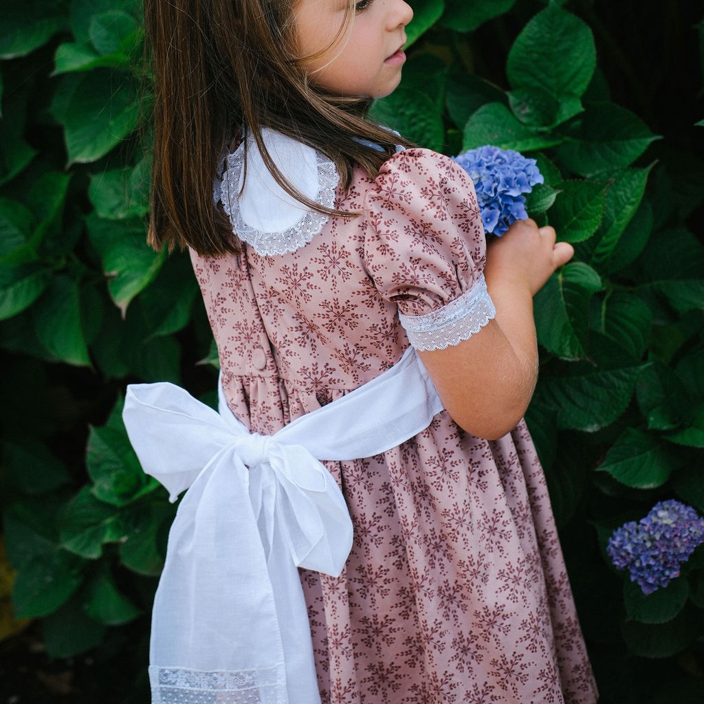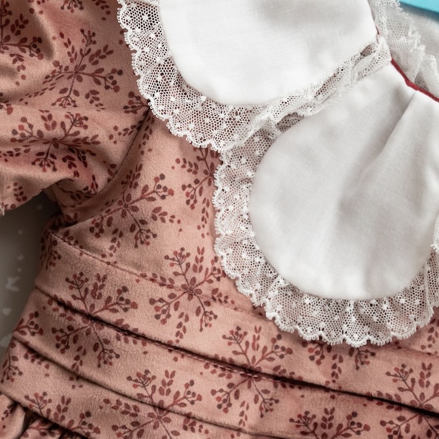 Um vestido cheio charme e delicadeza. Feito em veludo com um padrão floral subtil, corpo em nervuras e gola branca trabalhada com renda delicada. Mangas curtas em balão com acabamento de renda. A fita larga que termina num laço atrás acrescenta um toque romântico e elegante.