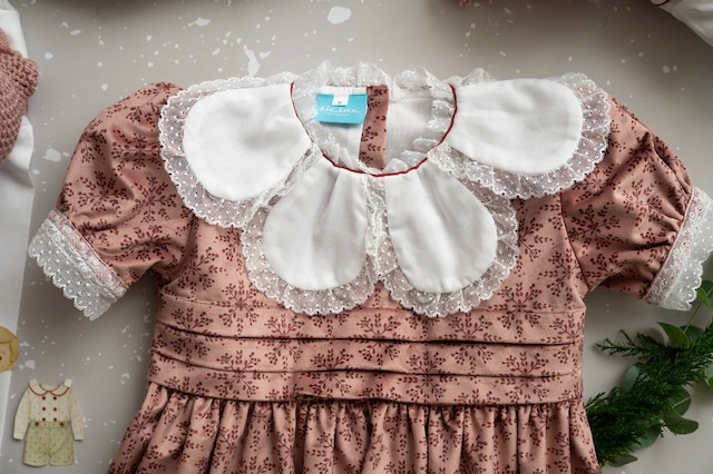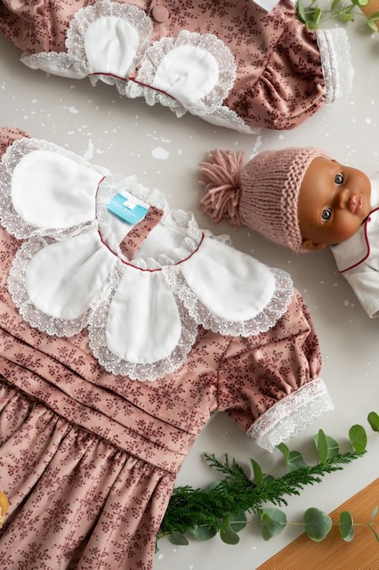 Vestido clássico em veludo com gola aos gomos com renda. Mangas de balão com renda e faixa atrás para laço também com renda. Um modelo delicado e intemporal, perfeito para coordenados irmãos e ocasiões especiais.
