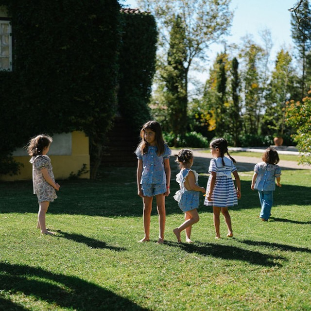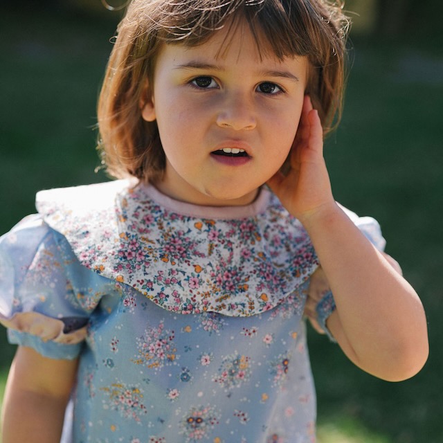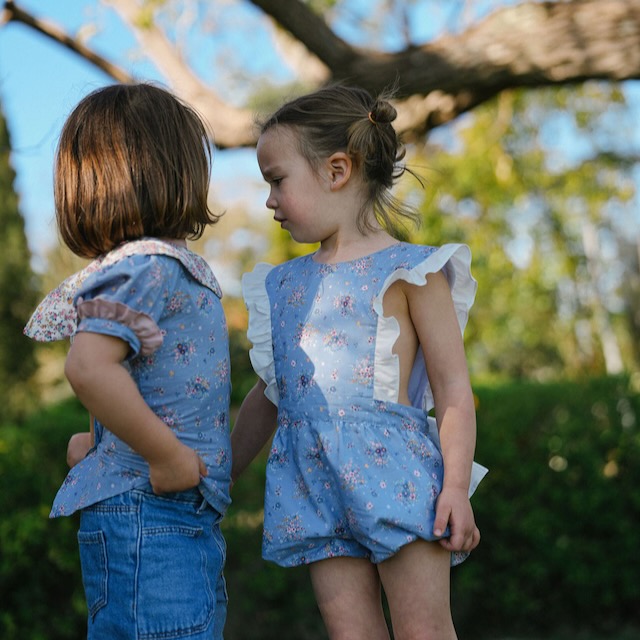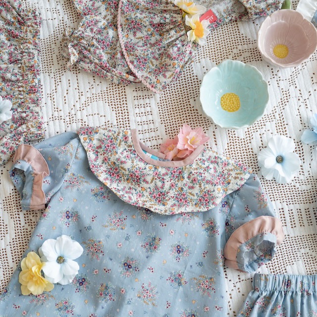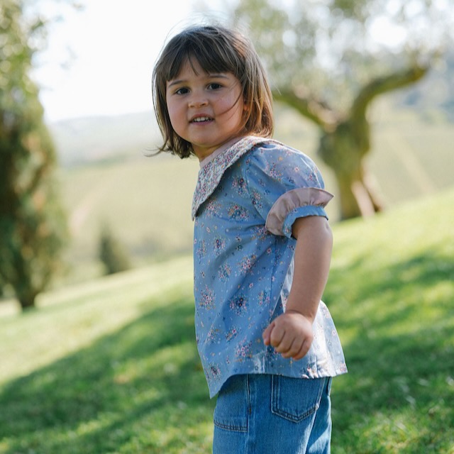 Uma camisa azul com estampado de pequenas flores, muito especial e cheia de graça. A gola em tecido de flores e os detalhes em cor de rosa nas mangas tornam esta peça ainda mais marcante.