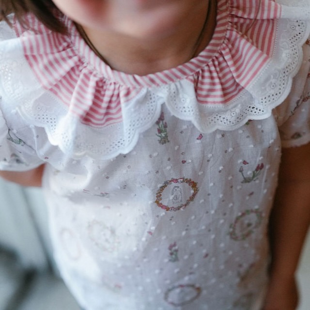 Uma camisa muito especial num padrão muito querido de flores e coelhinhos, com gola grande de riscas e bordado inglês. Com mangas de balão é uma camisa que não vai querer perder.
