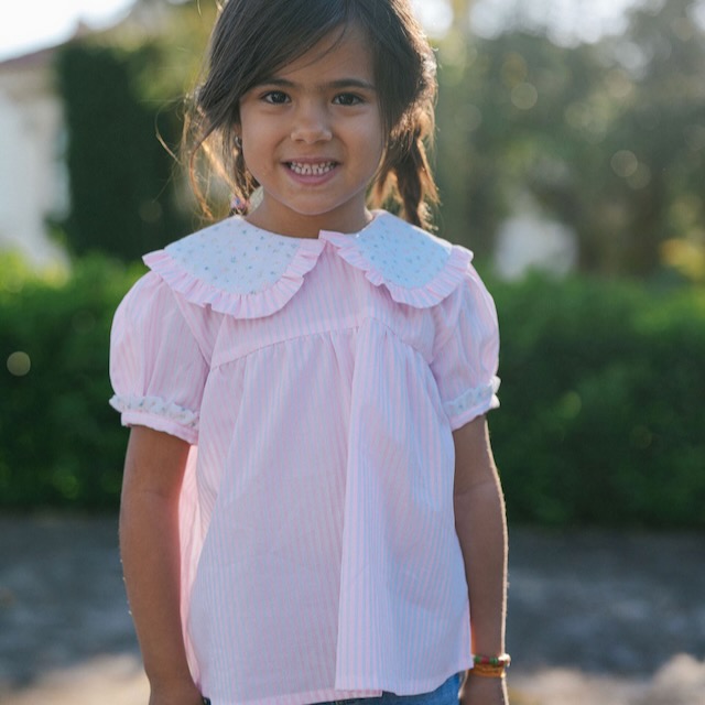 Uma camisa muito querida num tecido com de riscas cor de rosa e gola em florzinhas.