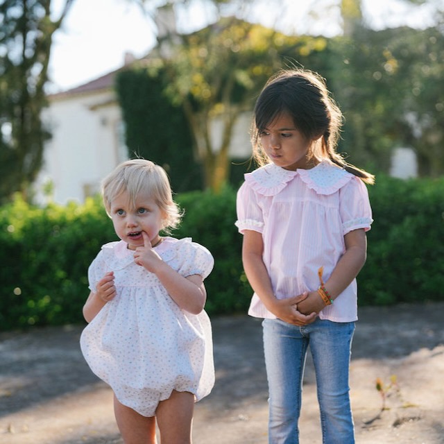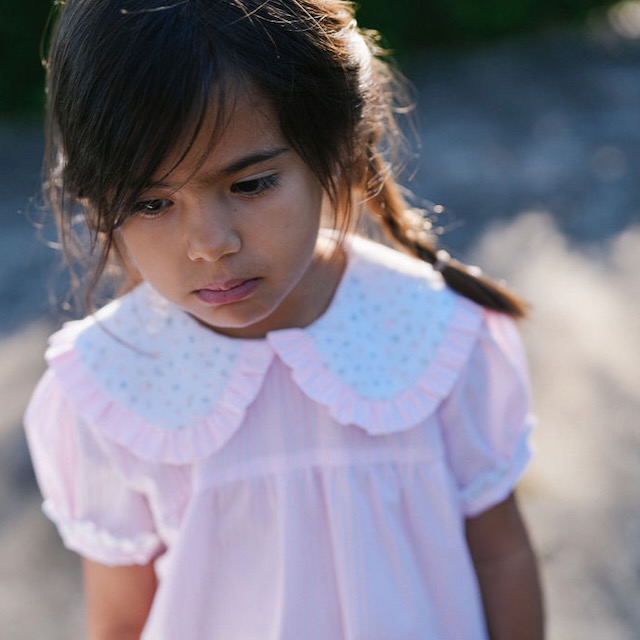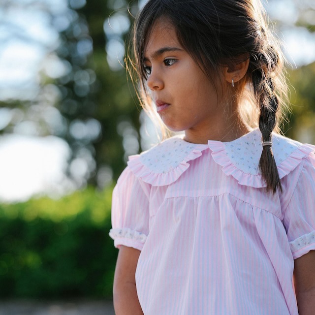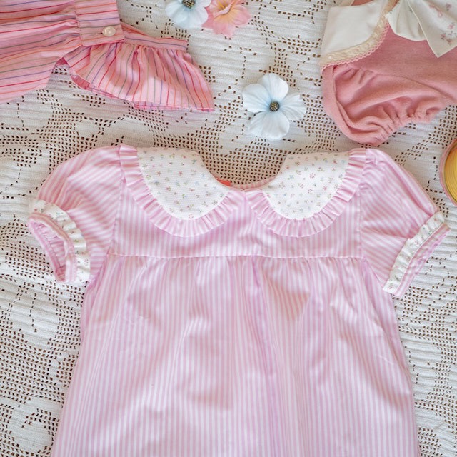 Num tecido ás riscas cor de rosa, destaca-se pela sua gola com padrão de pequenas flores, rematada com um folhinho que lhe dá um ar romântico e clássico. Os pormenores cuidadosamente trabalhados e o contraste de tecidos tornam esta peça verdadeiramente especial.