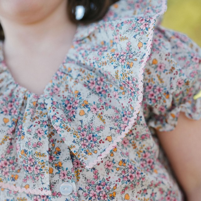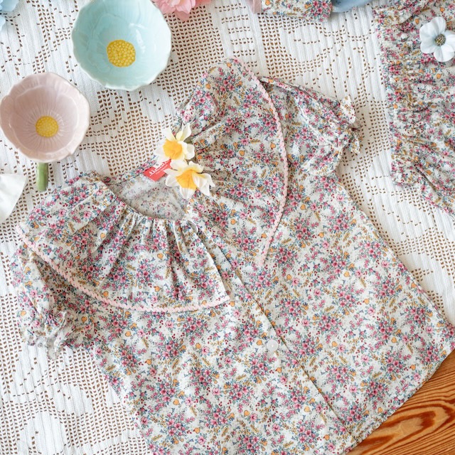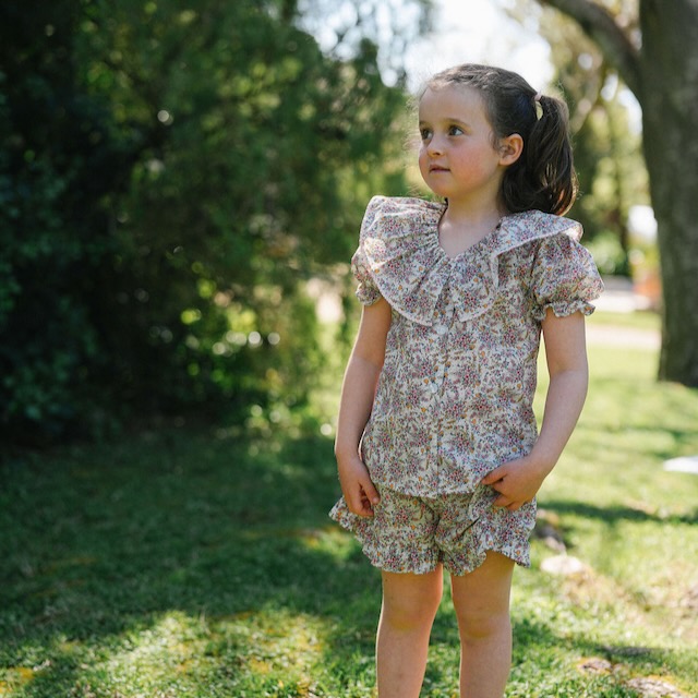 Um conjunto de flores muito especial, composto por camisa e calções a condizer. Com folho na gola e um estampado suave em vários tons, é uma opção fresca e cheia de graça para o verão.