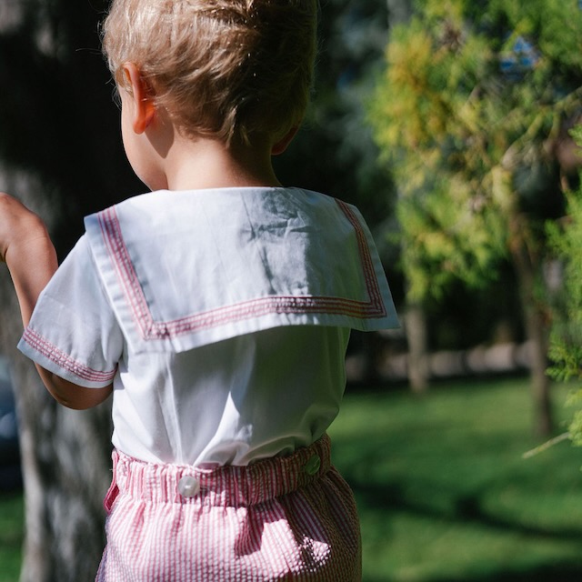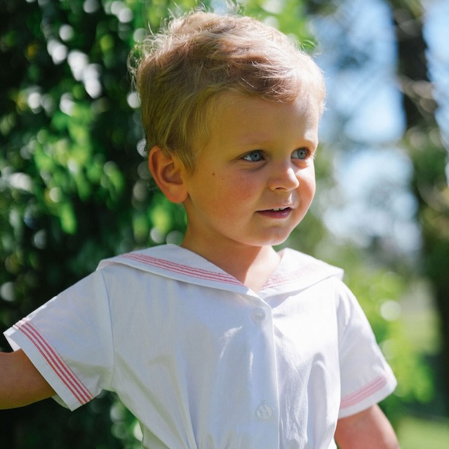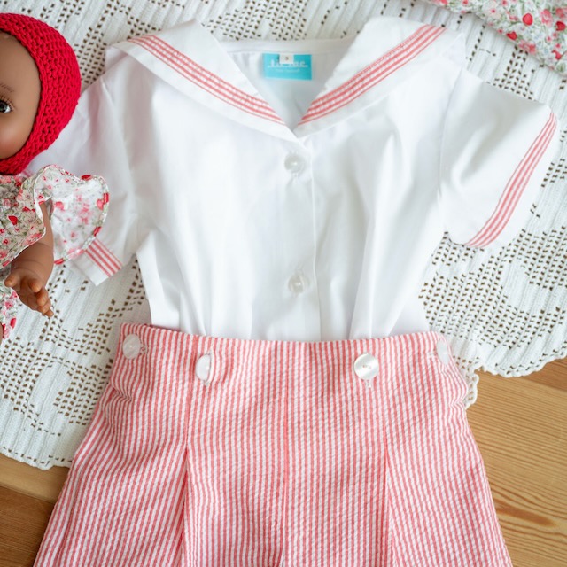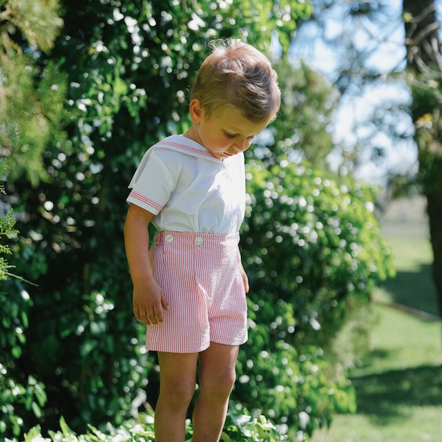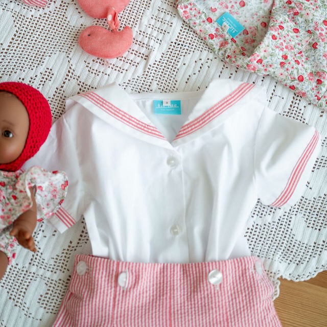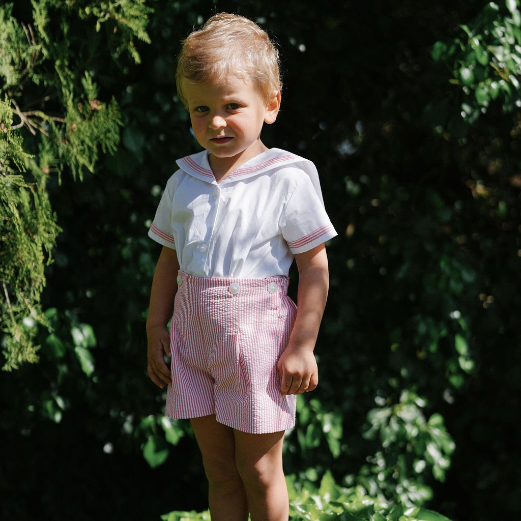 Um conjunto de verão clássico e muito especial, pensado para acompanhar os dias mais bonitos desta estação. Composto por uma camisa branca com gola marujo e calções às riscas em encarnado e branco.