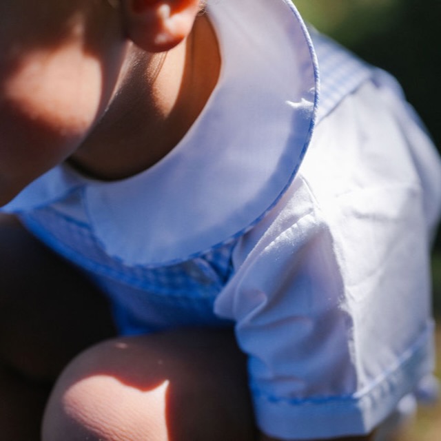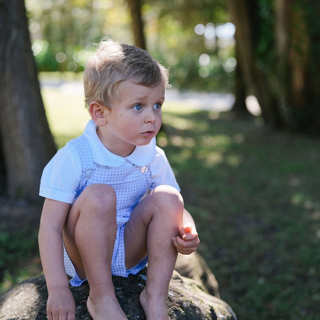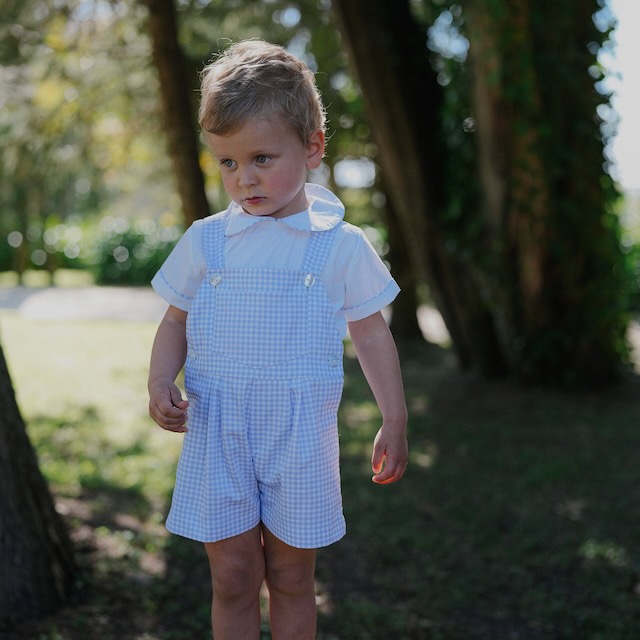 Um conjunto de rapaz muito querido, composto por jardineiras curtas em vichy lavanda e camisa branca de manga curta. Fresco, clássico e confortável, é perfeito para os dias de verão.
