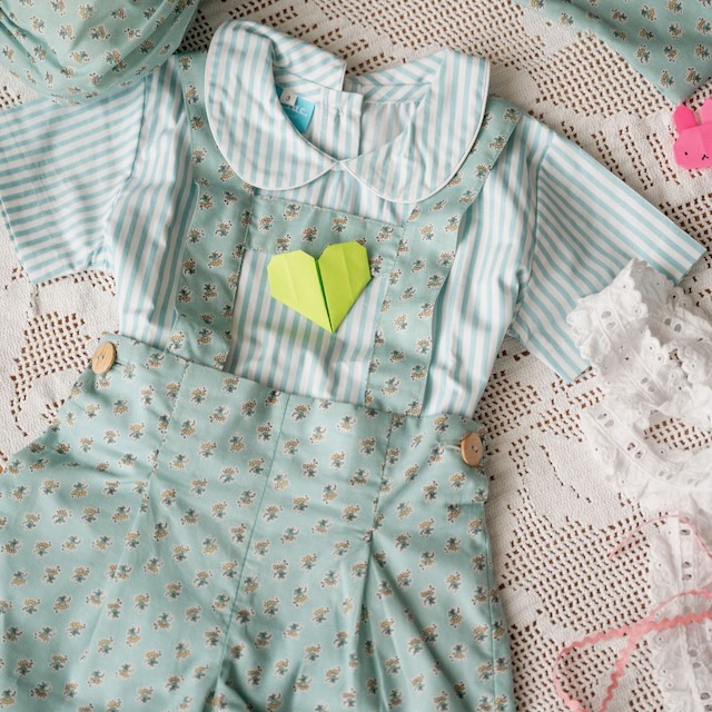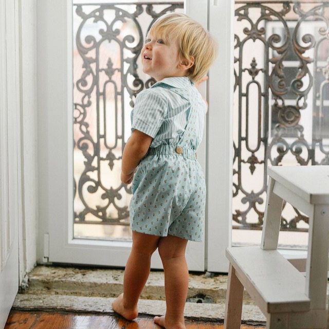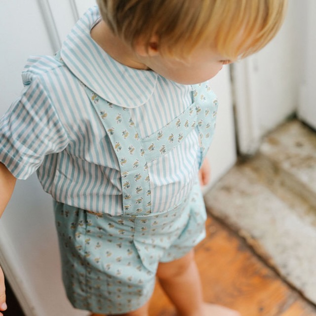 Um conjunto pensado para os dias bons de verão:leve, querido e cheio de detalhe. A camisa às risquinhas em verde-água, com gola redonda, combina na perfeição com os calções no  padrão de flores pequeninas da coleção, criando um look fresco e cheio de charme.