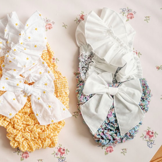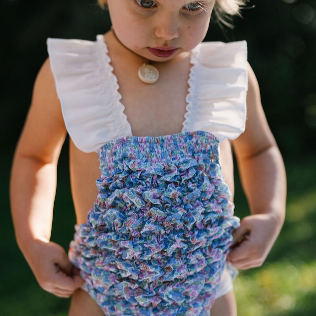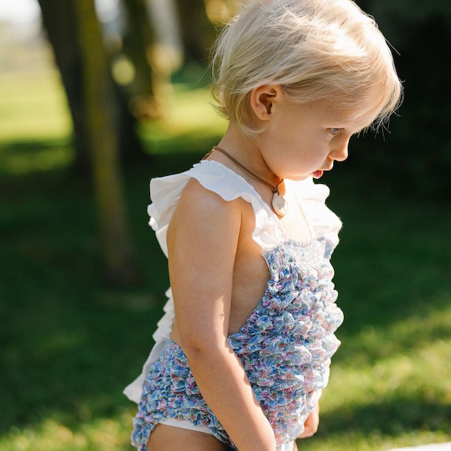 Um fato de banho feito à mão pensado para quem procura uma peça mesmo especial para o verão. O corpo franzido em tecido de flores adapta-se ao corpo com conforto, enquanto os folhos brancos nas alças e o laço atrás lhe dão um ar muito bonito e cheio de graça.