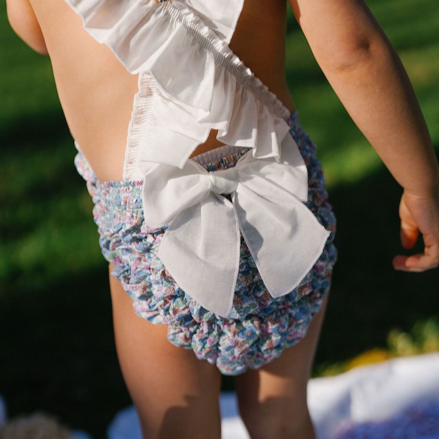 Um fato de banho muito especial, feito à mão com estampado de flores em tons suaves. Com folhos brancos nas alças e um laço grande nas costas, é uma peça cheia de charme e verdadeiramente única.