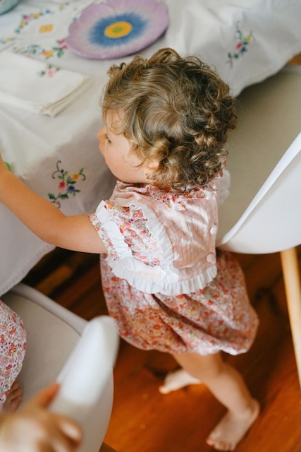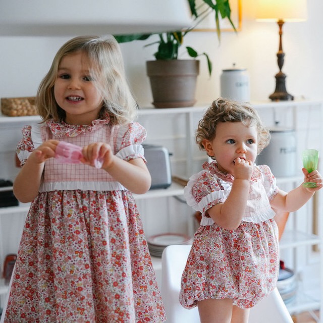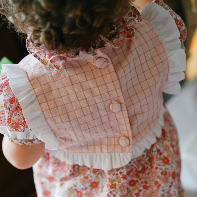 O corpo aos quadradinhos dá-lhe um ar clássico e arranjadinho, enquanto o tecido de flores traz leveza, frescura e um toque alegre. As mangas de balão com folhos e os detalhes brancos acrescentam ainda mais charme a esta peça, tornando-a perfeita para passeios, festas e ocasiões especiais em família.