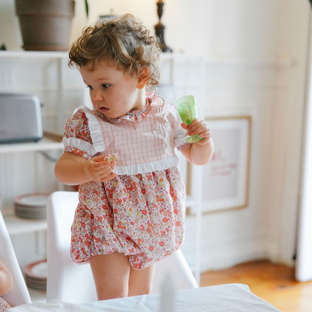 Um fofo muito querido, com uma combinação de flores e quadradinhos cor de rosa, perfeito para dias de verão e momentos especiais. Confortável, fresco e com acabamentos cheios de charme, foi pensado para acompanhar os bebés no dia a dia.