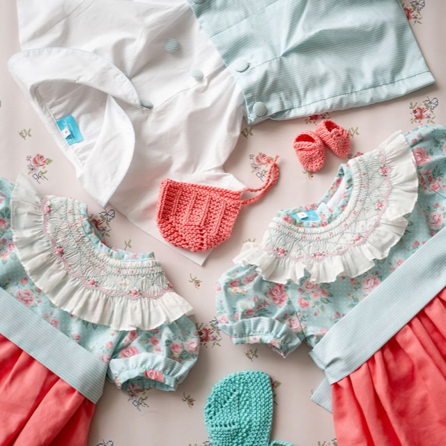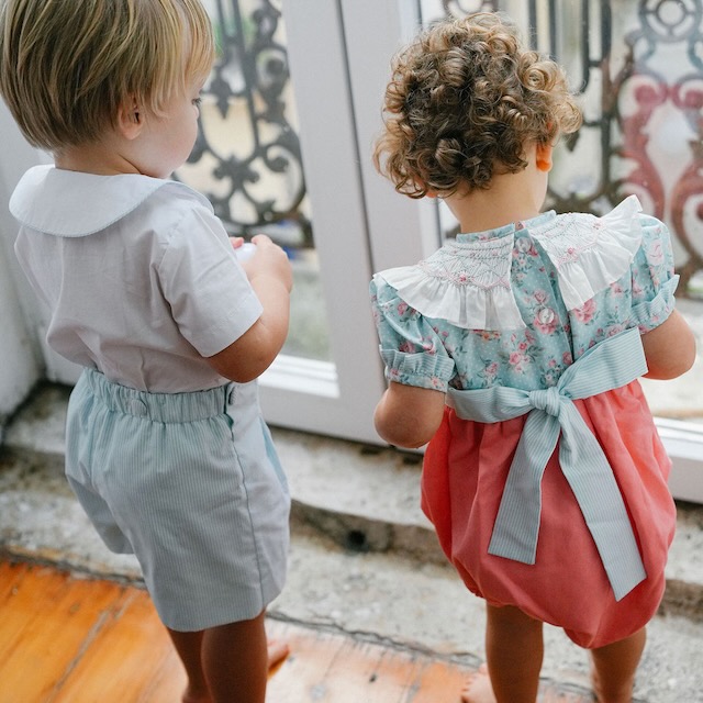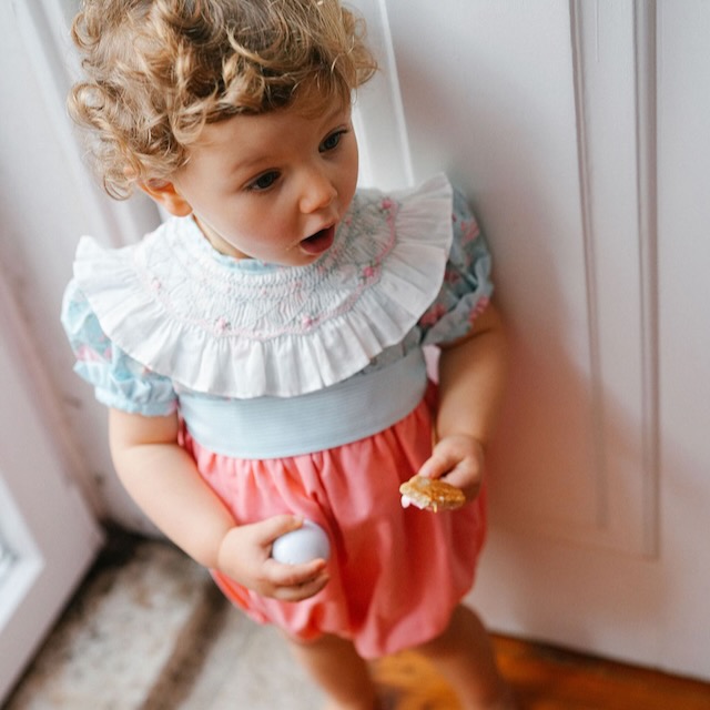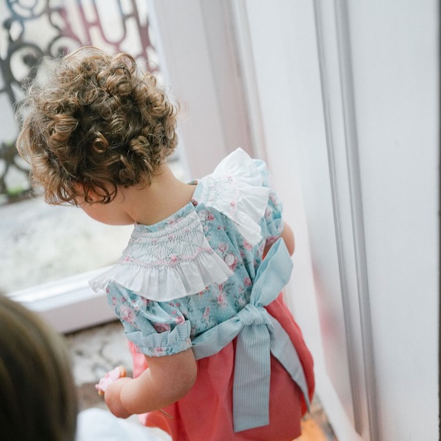 Um fofo muito especial, com gola de smocks bordada à mão, corpo em flores e parte debaixo em linho coral. Delicado, fresco e cheio de charme, é perfeito para dias de verão e momentos especiais.