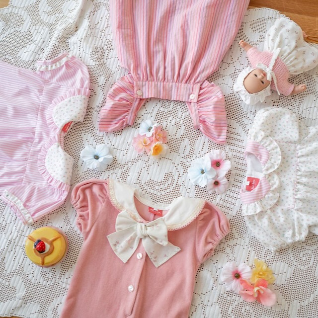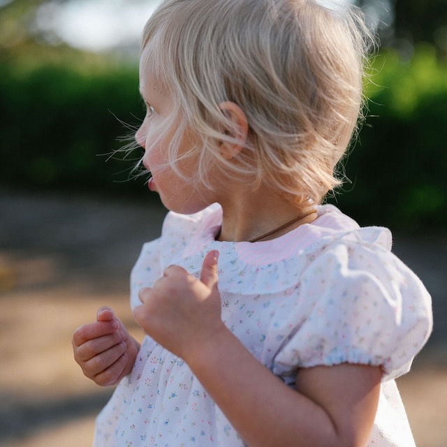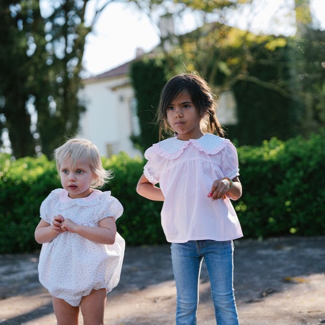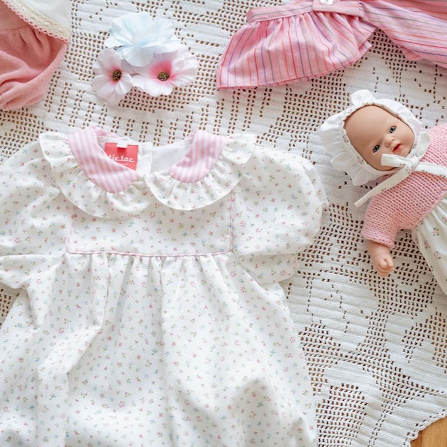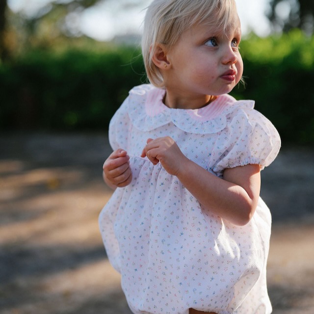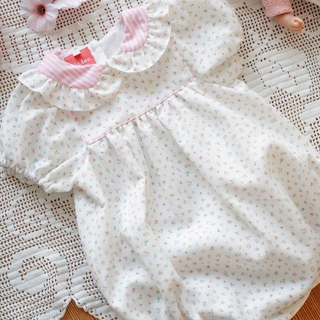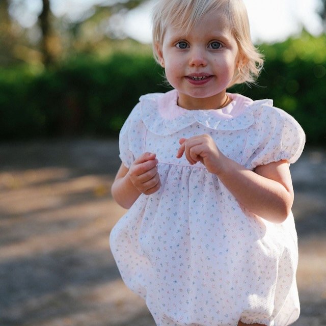 Um fofo muito querido, em tecido branco com pequenas flores suaves e gola às risquinhas cor de rosa. Leve, fresco e cheio de graça, é uma peça especial para os primeiros anos.