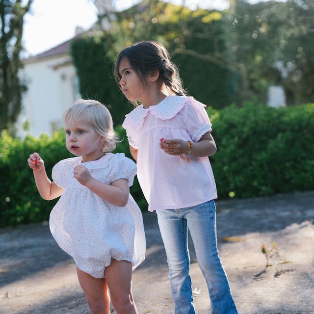 Um fofo branco com flores pequeninas, pensado para vestir os primeiros anos com leveza e um ar muito querido. A gola às risquinhas cor de rosa e o folho no peito dão-lhe um toque especial, enquanto o corte solto e confortável o torna muito prático para os dias de verão.