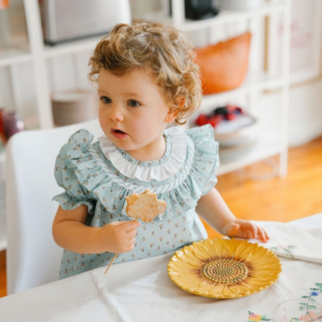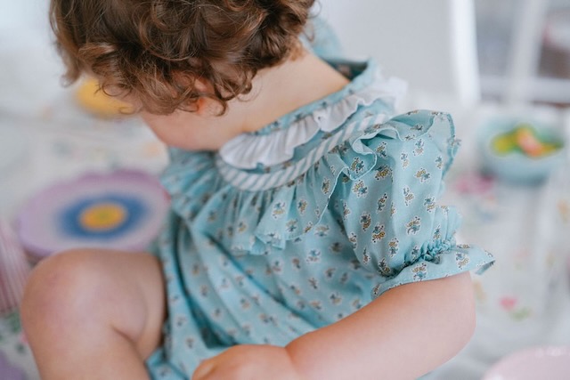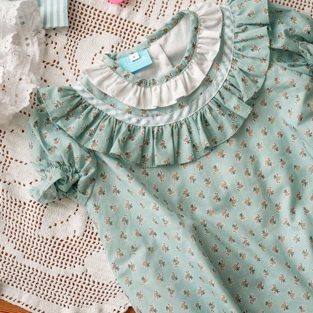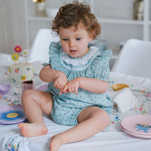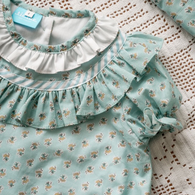 Fofo em tom verde-água com padrão com florzinhas, mangas de balão com elástico e gola branca em folho. Fresco, confortável e perfeito para os dias bons. Disponível dos 6 meses aos 2 anos e com peças a condizer para irmãos ou primos.