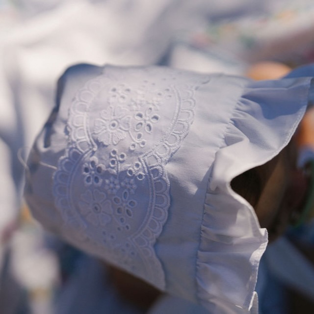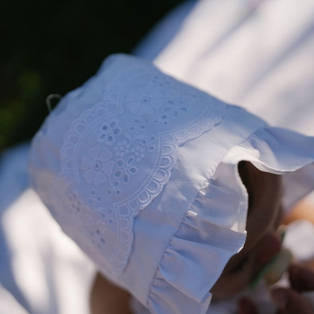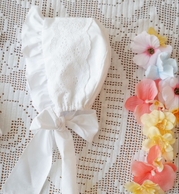 Uma touca branca com bordado inglês, pensada para dar um toque muito especial aos conjuntos de verão. Com folho na frente e laço para ajustar, destaca-se pelos detalhes cuidados e pelo ar clássico que nunca passa de moda.