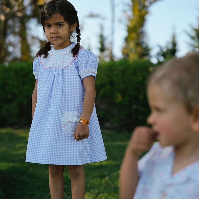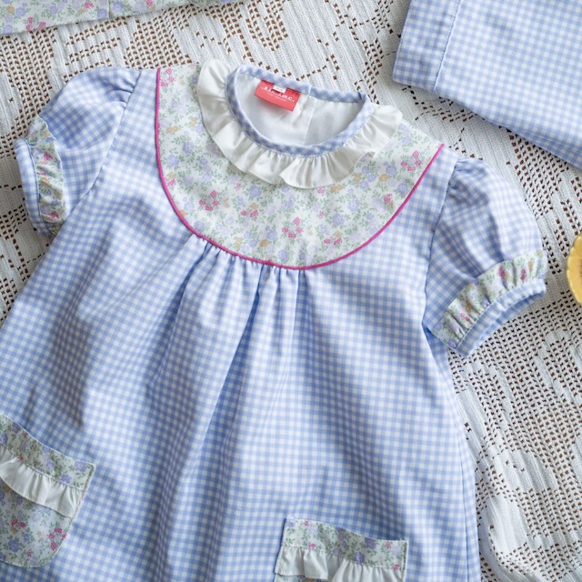 Este vestido muito querido em vichy lavanda, destaca-se pela gola em folho, pelo corpo em tecido de flores e pelo vivo em cor de rosa, que lhe dão um ar cuidado e cheio de encanto.
